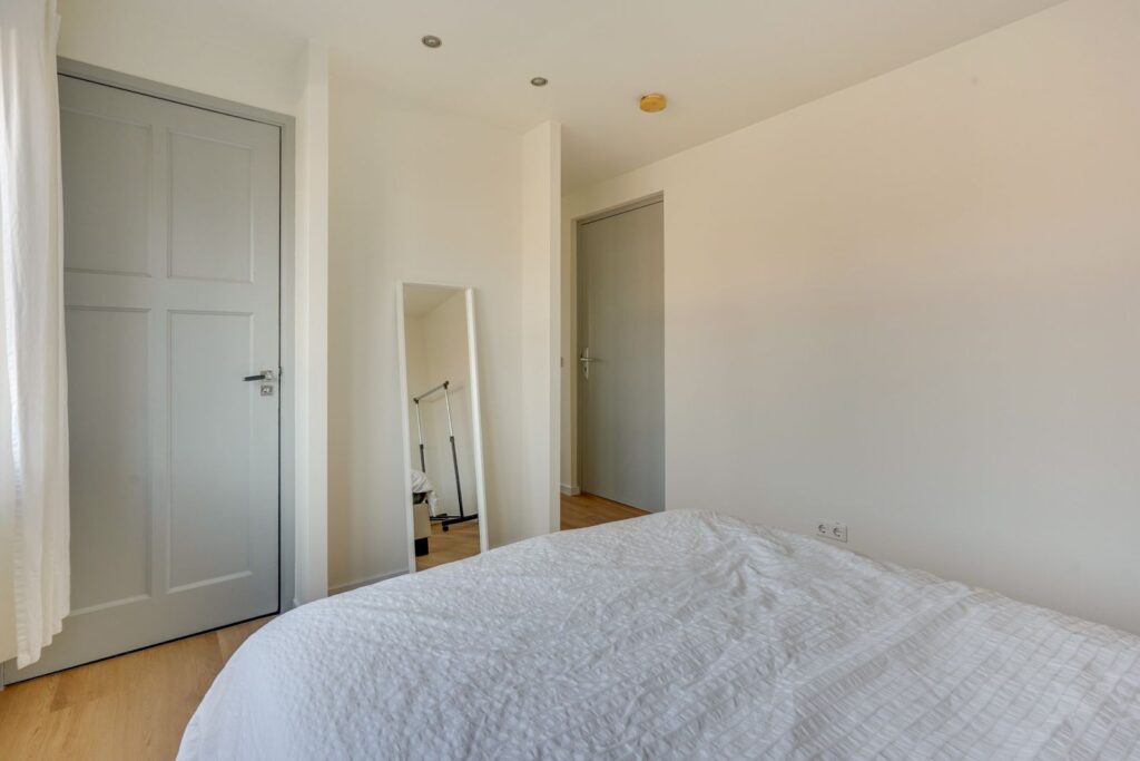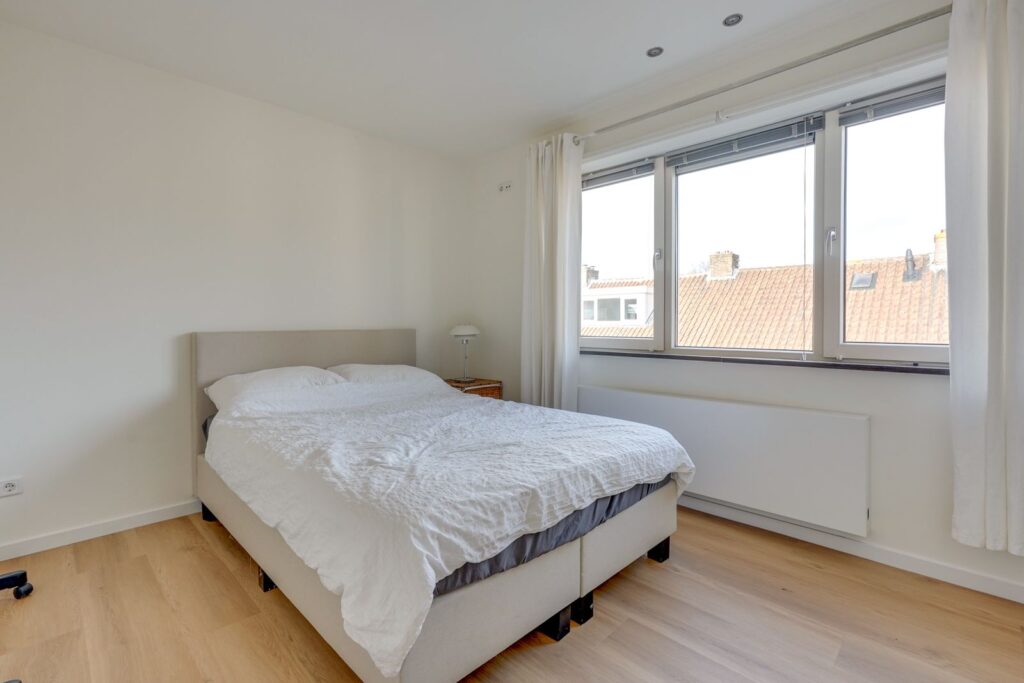 Aan de achterzijde van het appartement ligt de slaapkamer. Ook deze kamer heeft een groot raam waardoor er veel daglicht binnenkomt. Er is voldoende ruimte voor een tweepersoonsbed en een kast.