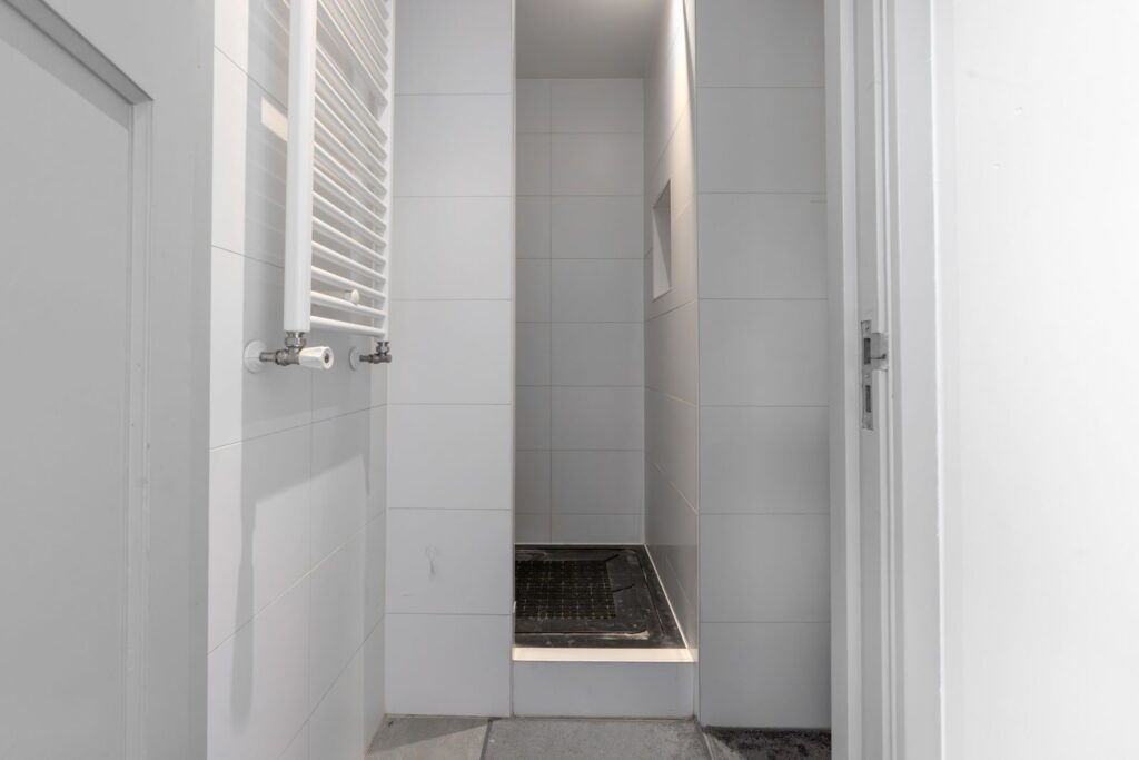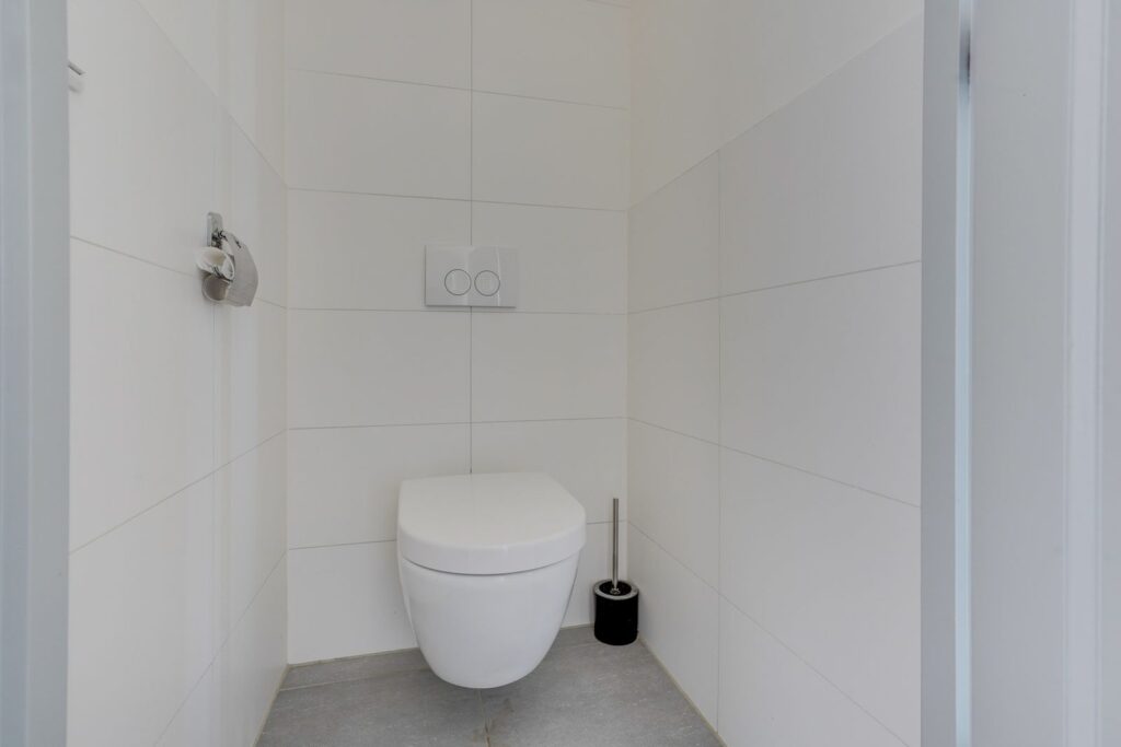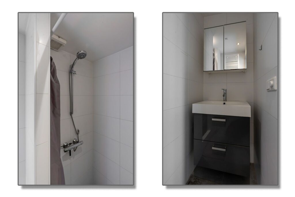 De badkamer is compact maar netjes afgewerkt en voorzien van een douche en wastafelmeubel. Het toilet is separaat en bereikbaar vanuit de hal.