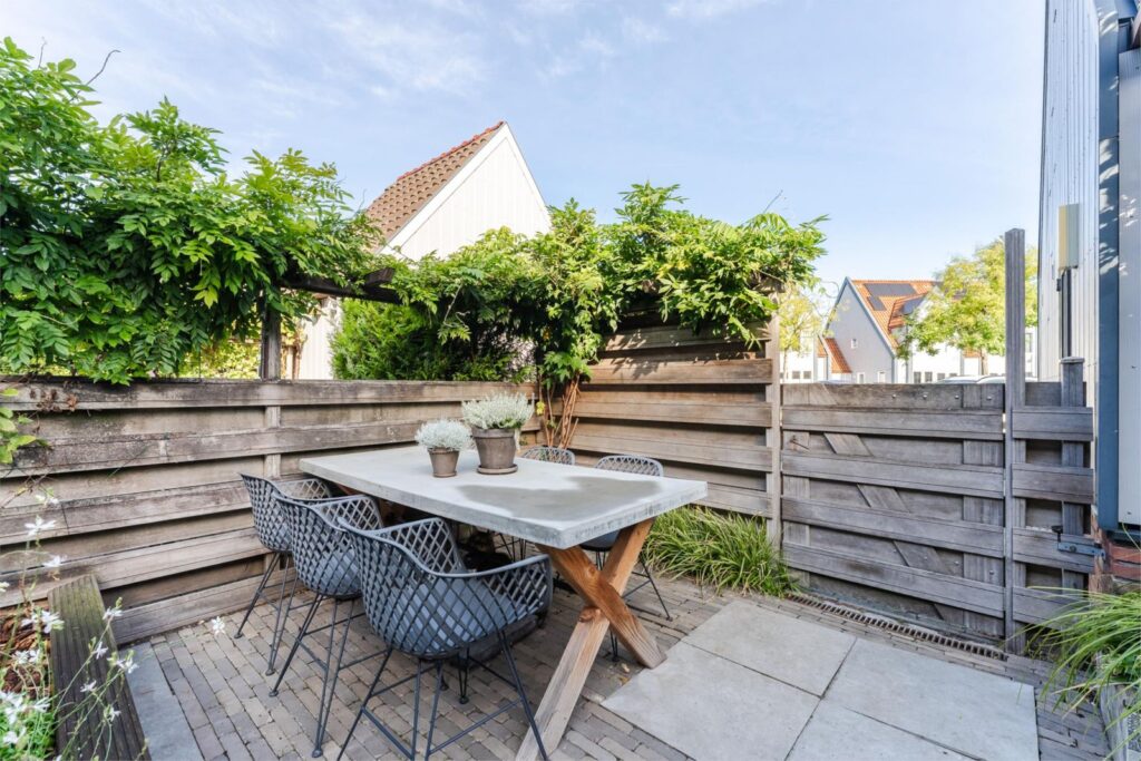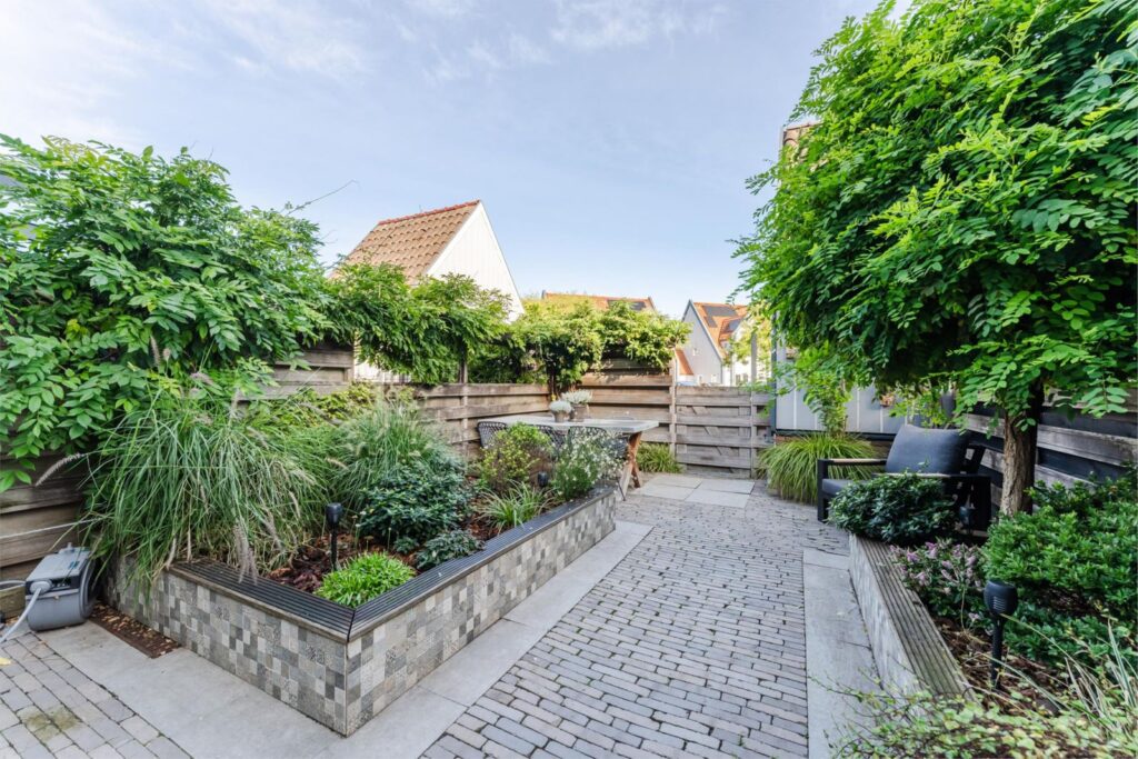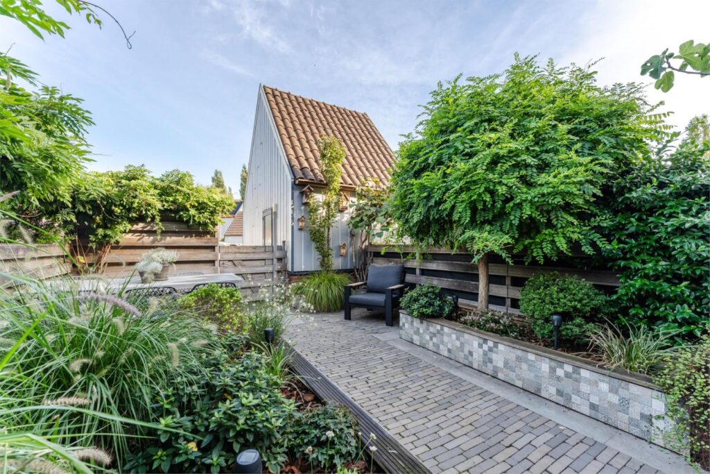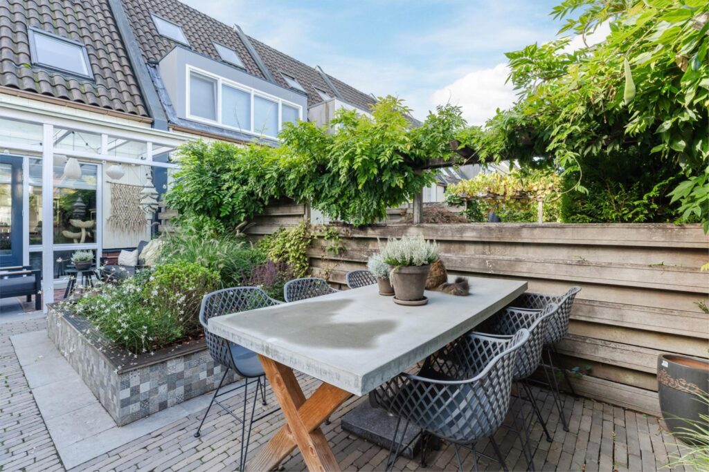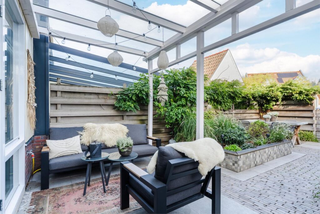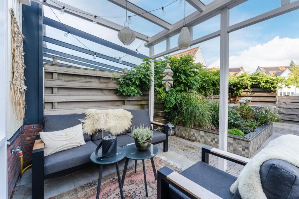 De sfeervolle tuin is gelegen op het noorden, maar biedt de hele zomer zowel zon als schaduw. Hierdoor is het op elk plekje in de tuin heerlijk vertoeven. Zelfs bij regen kun je nog lekker buiten onder de overkapping zitten.
