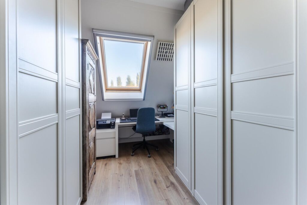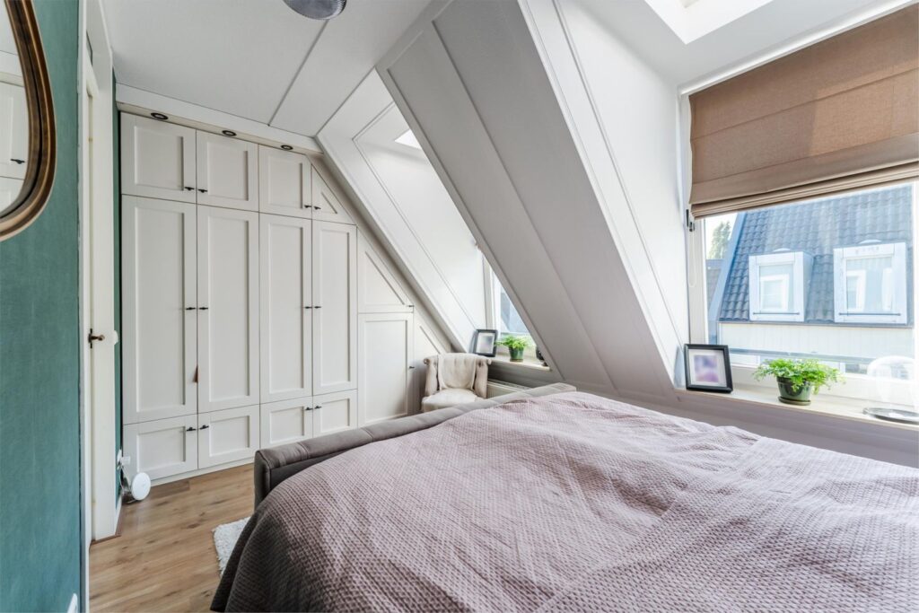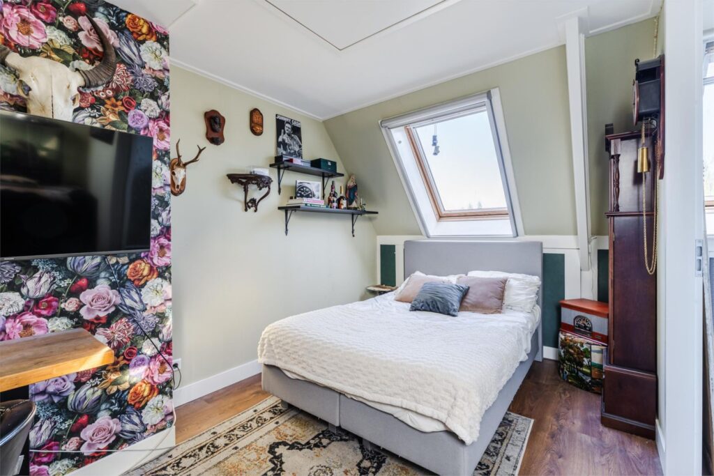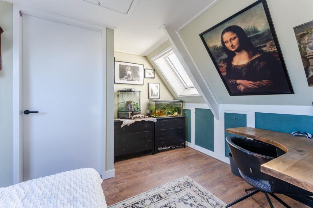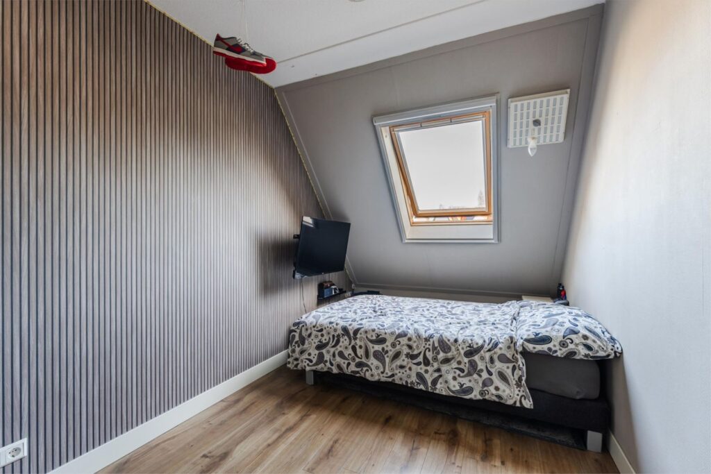 Vierde ruime slaapkamer. Ook voorzien van 2 Velux dakramen, knieschotten met bergruimte en Vlizotrap naar bergvliering. Bergvliering heeft geen stahoogte maar biedt wel voldoende opbergmogelijkheden.