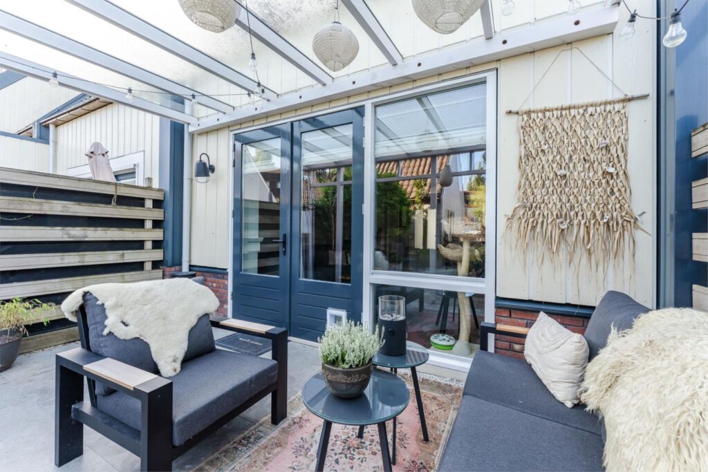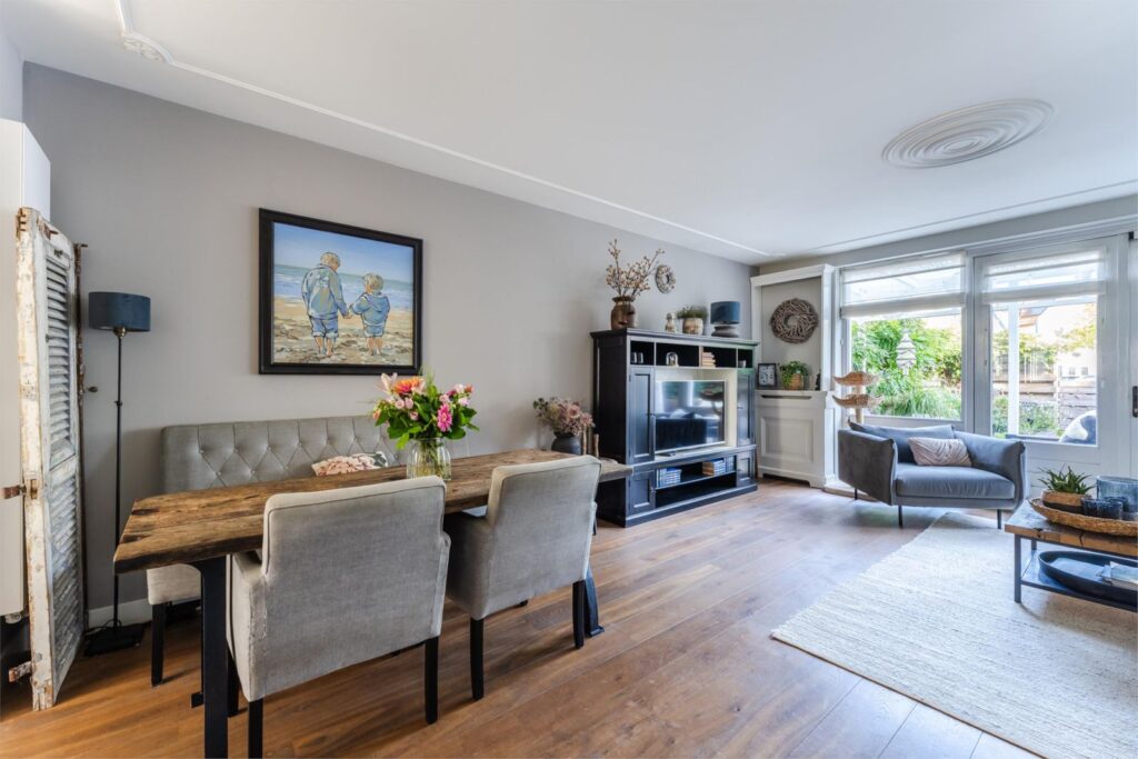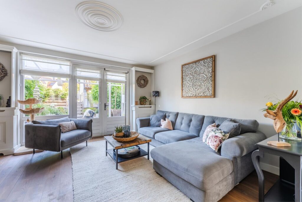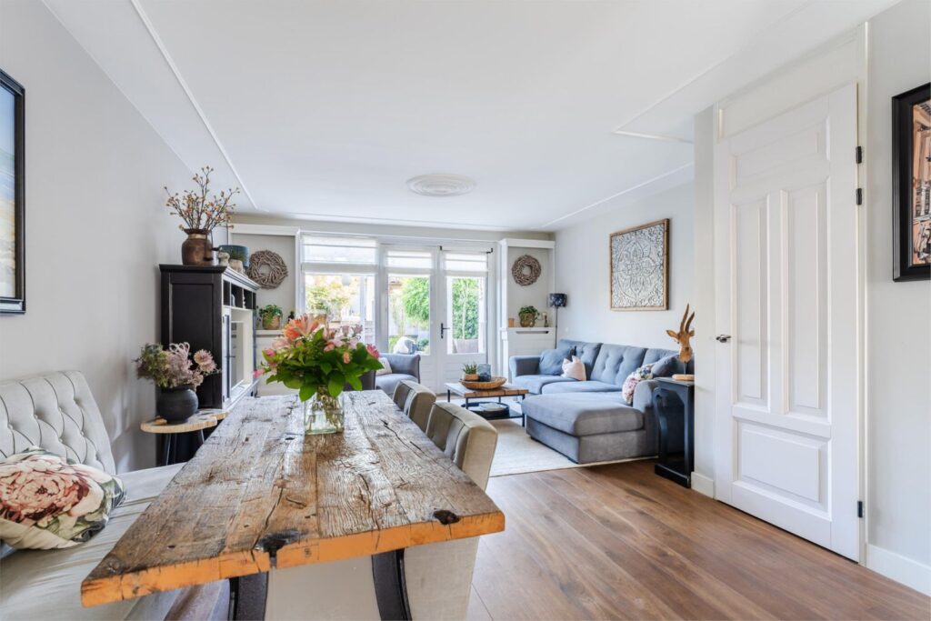 De woonkamer is tuingericht, voorzien van grote ramen en openslaande deuren. Hierdoor lopen binnen en buiten mooi in elkaar over.