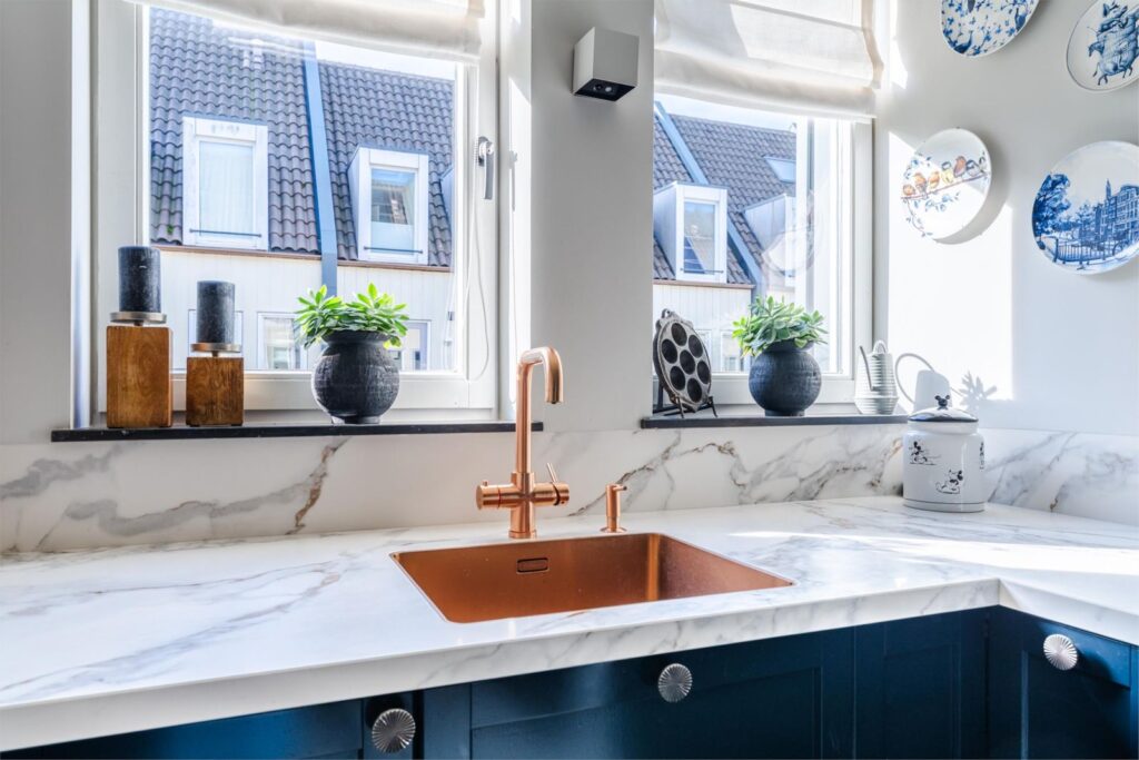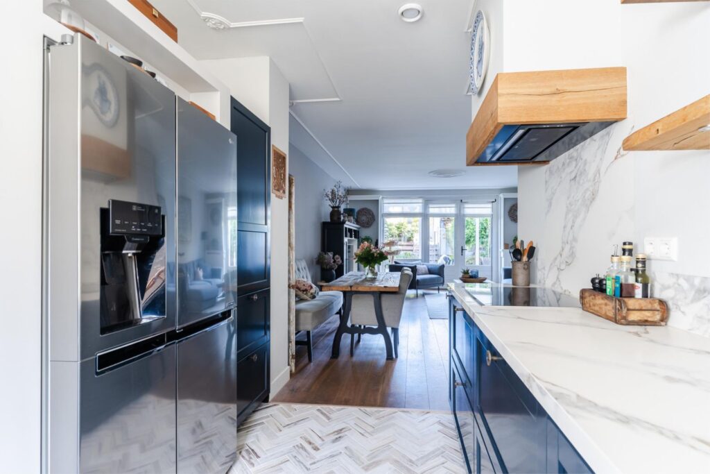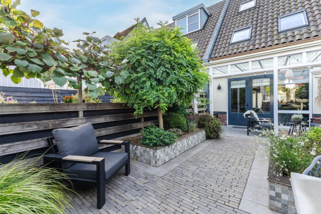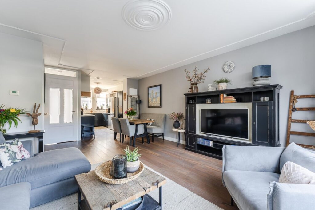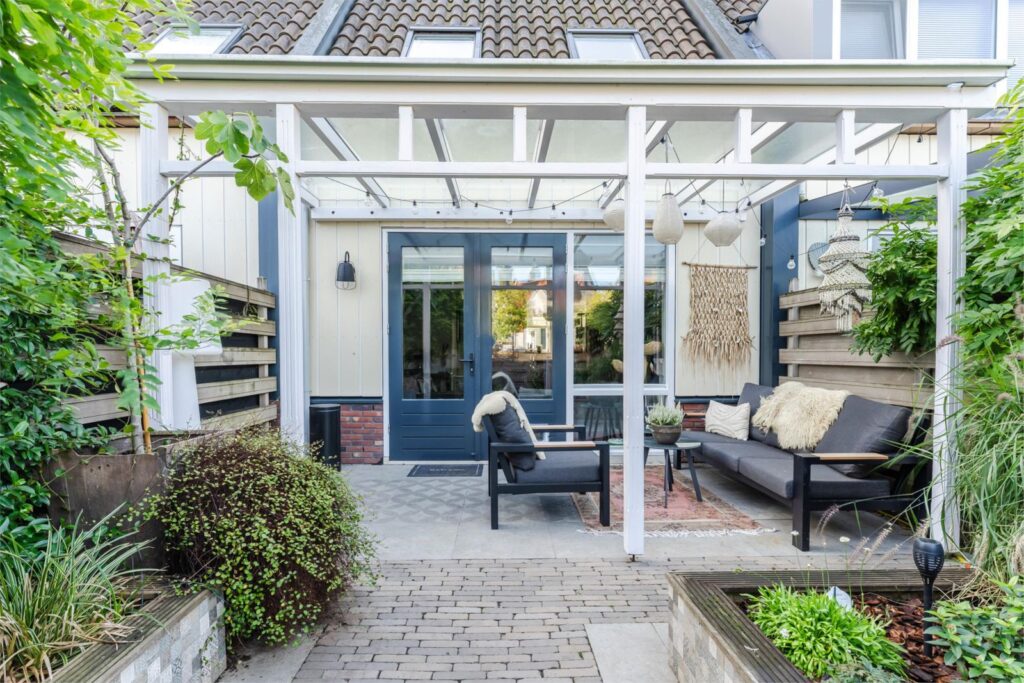 De woonkamer is tuingericht, voorzien van grote ramen en openslaande deuren. Hierdoor lopen binnen en buiten mooi in elkaar over.