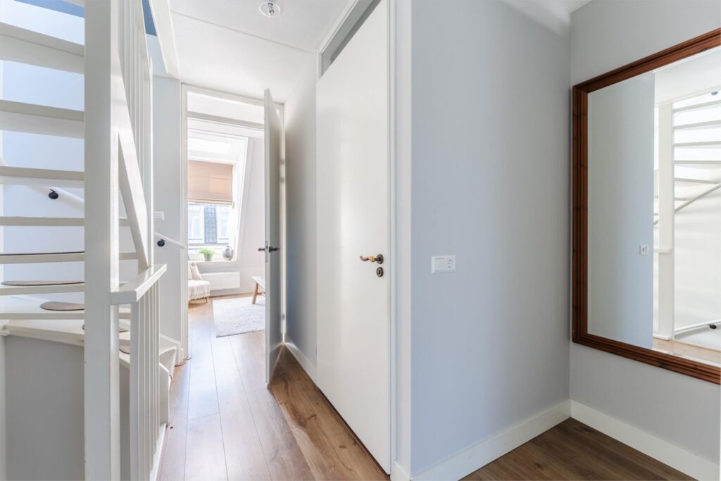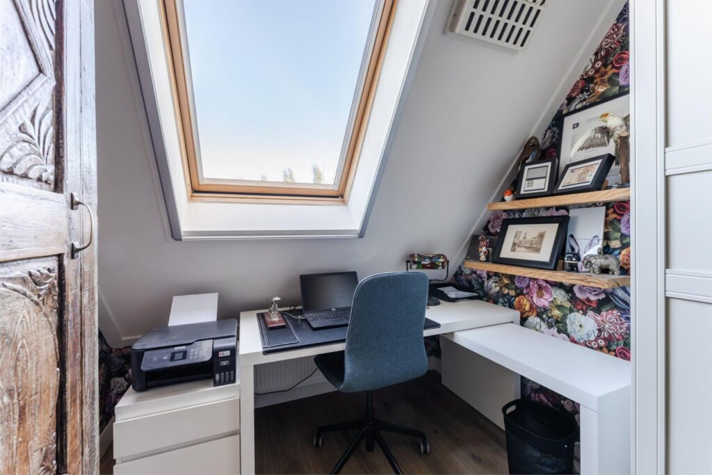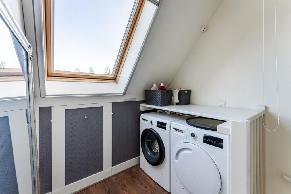 Via de open trap kom je op de lichte overloop welke is voorzien van Velux dakraam en de wasmachine- en drogeraansluiting.