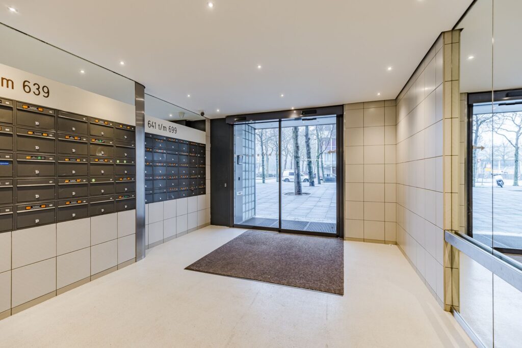 Via de hoofdentree met extra nachtbeveiliging kom je binnen in de ruime hal met brievenbussen en tweede intercom. Hier bevinden zich: