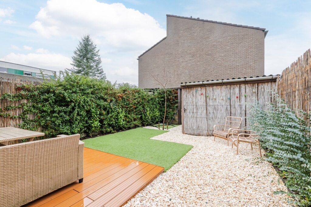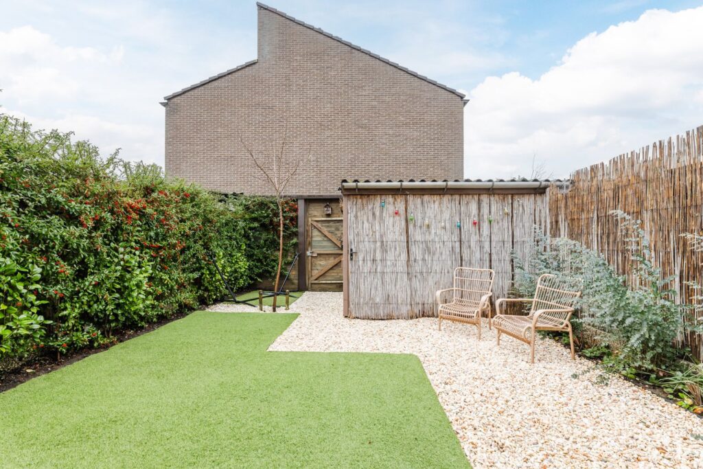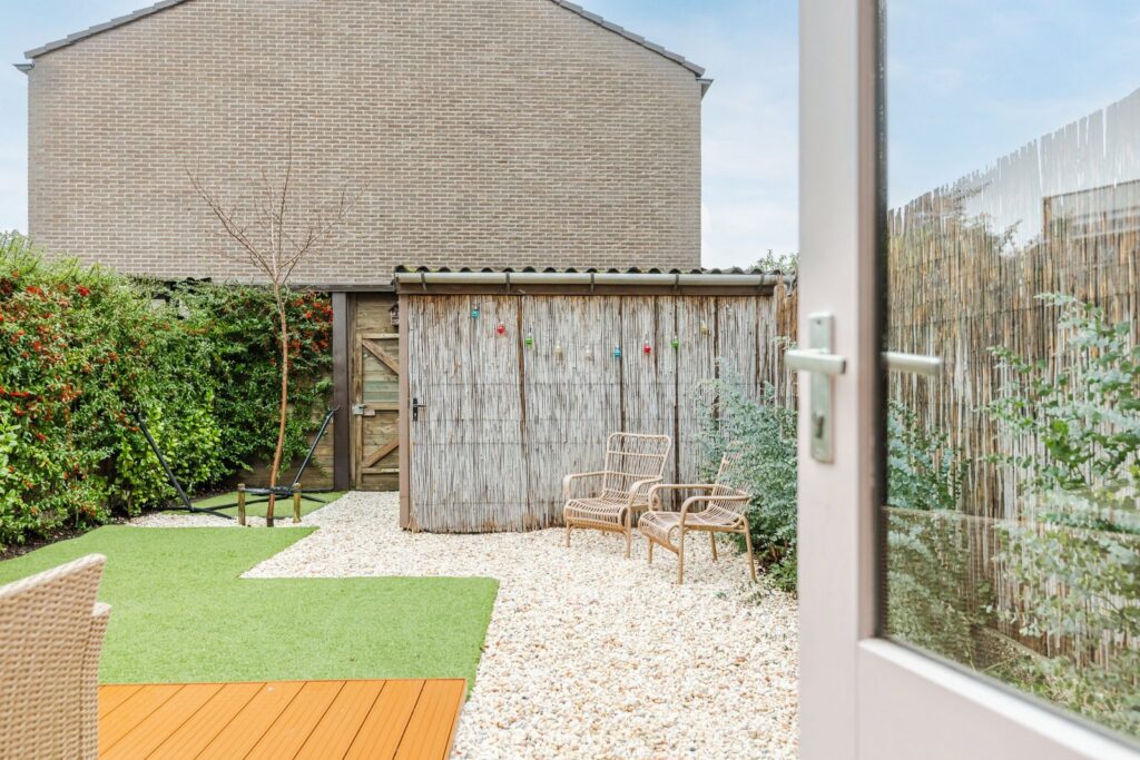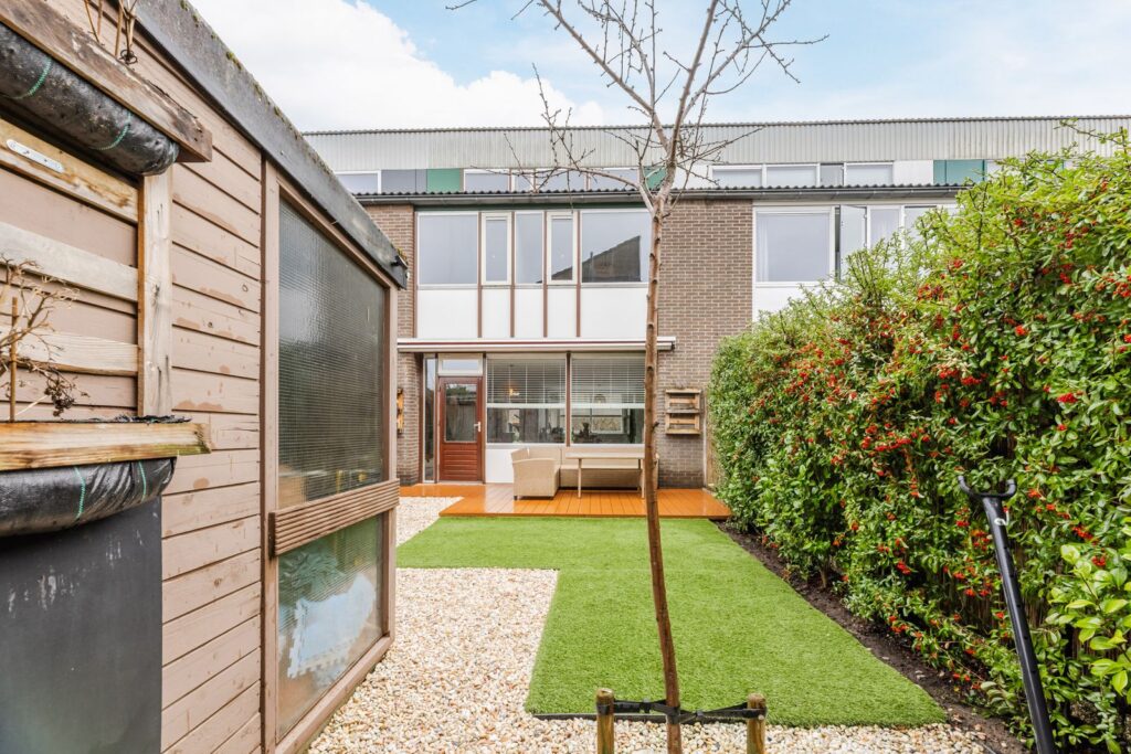 De achtertuin is circa 9,7 meter diep, gelegen op het westen en in mei 2022 opnieuw aangelegd. Hier geniet je volop van de middag- en avondzon. Achterin de tuin staat een ruime houten berging v.v. elektra.