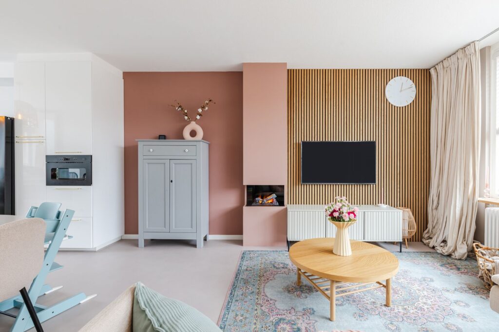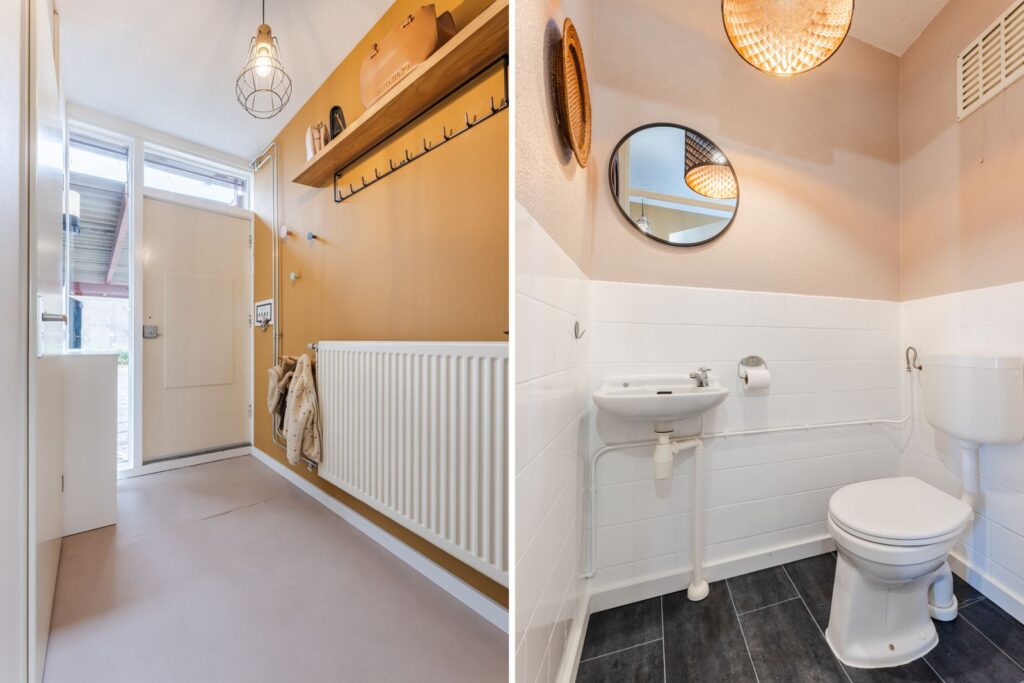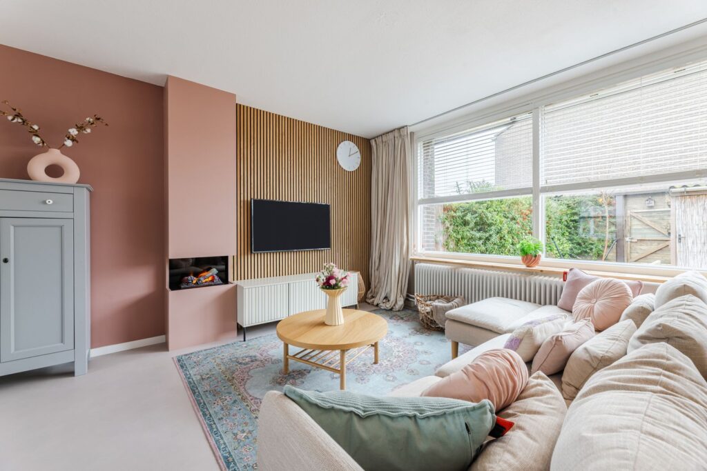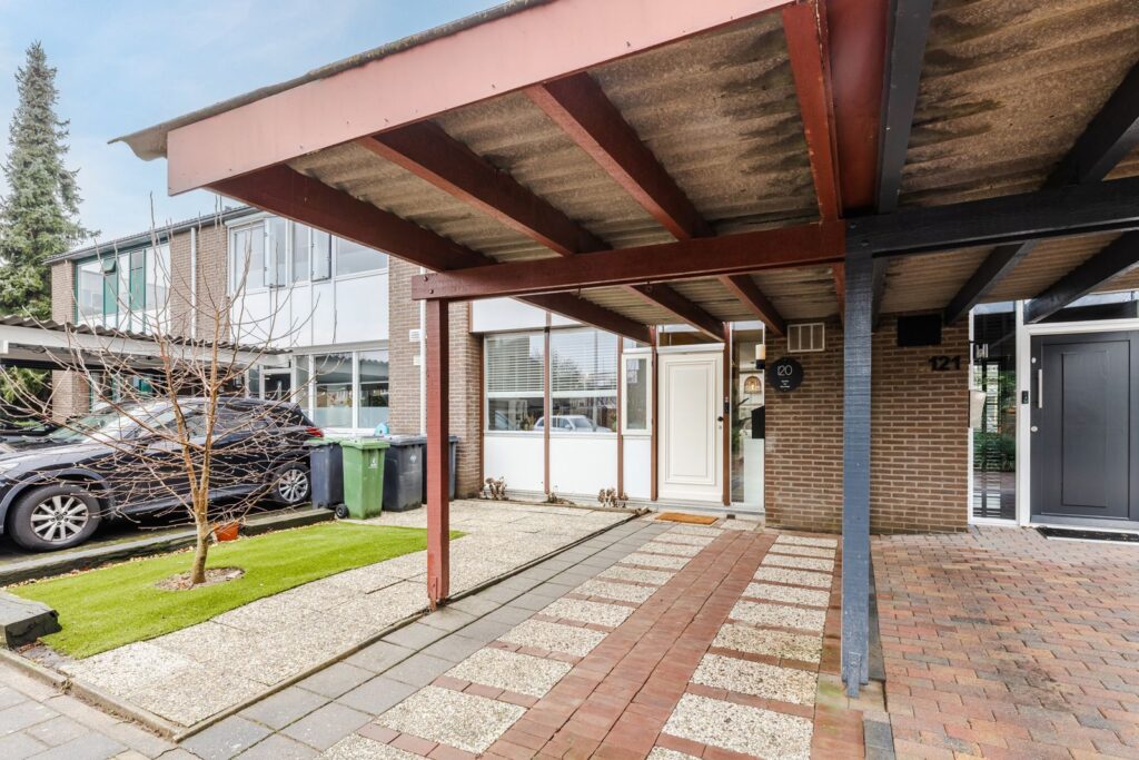 Begane grond: Via de voortuin met carport kom je binnen in de hal met toilet en moderne meterkast. De ruime tuingerichte woonkamer is in november 2024 sfeervol afgewerkt met een waterdamp-haard en een luxe tv-wand met akoestische panelen. Grote ramen en de tuindeur zorgen voor veel lichtinval en een fijne verbinding met de achtertuin.