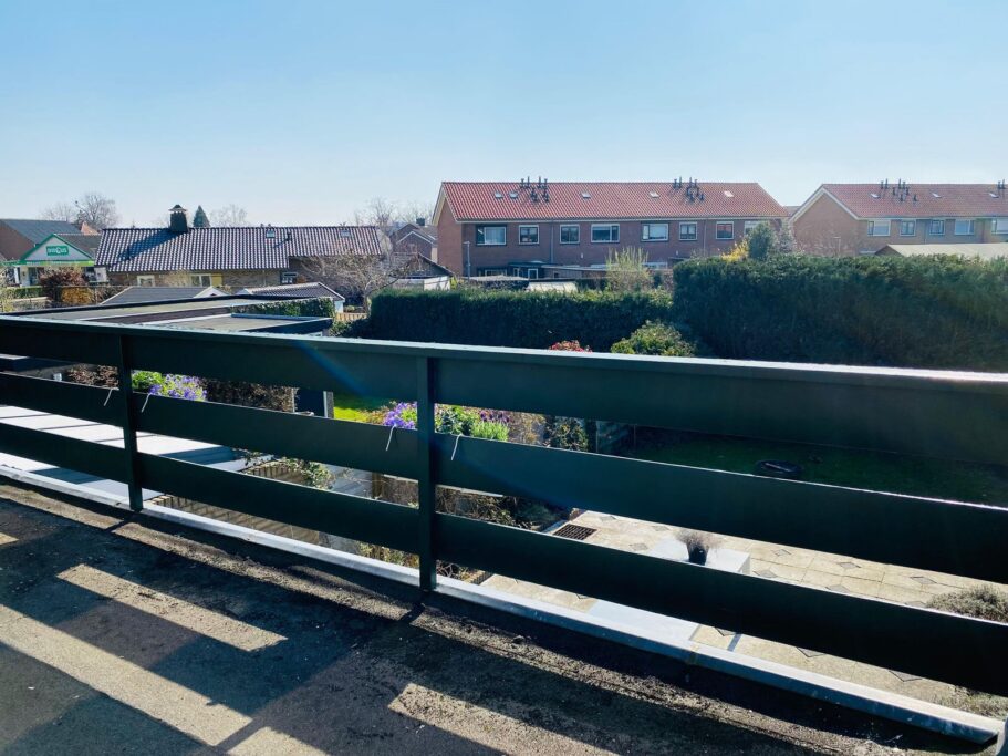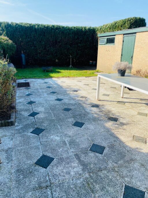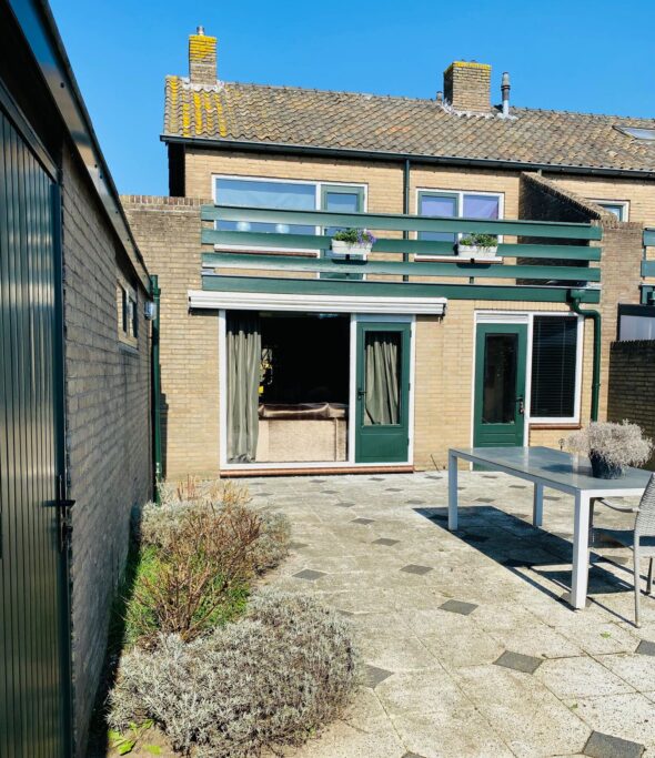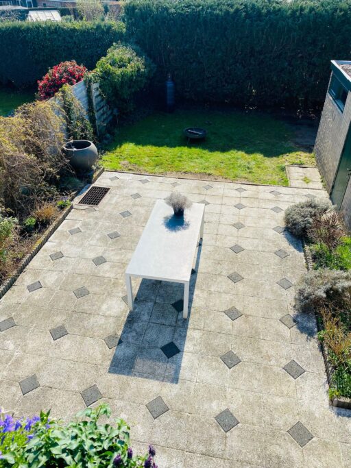 De achtertuin ligt gunstig op het zuiden en biedt veel privacy en zonuren. De verlengde garage (ca. 3,0 x 8,7 m) is halfsteens gebouwd, voorzien van elektra en een plat dak. Ideaal voor auto, fietsen of werkruimte.