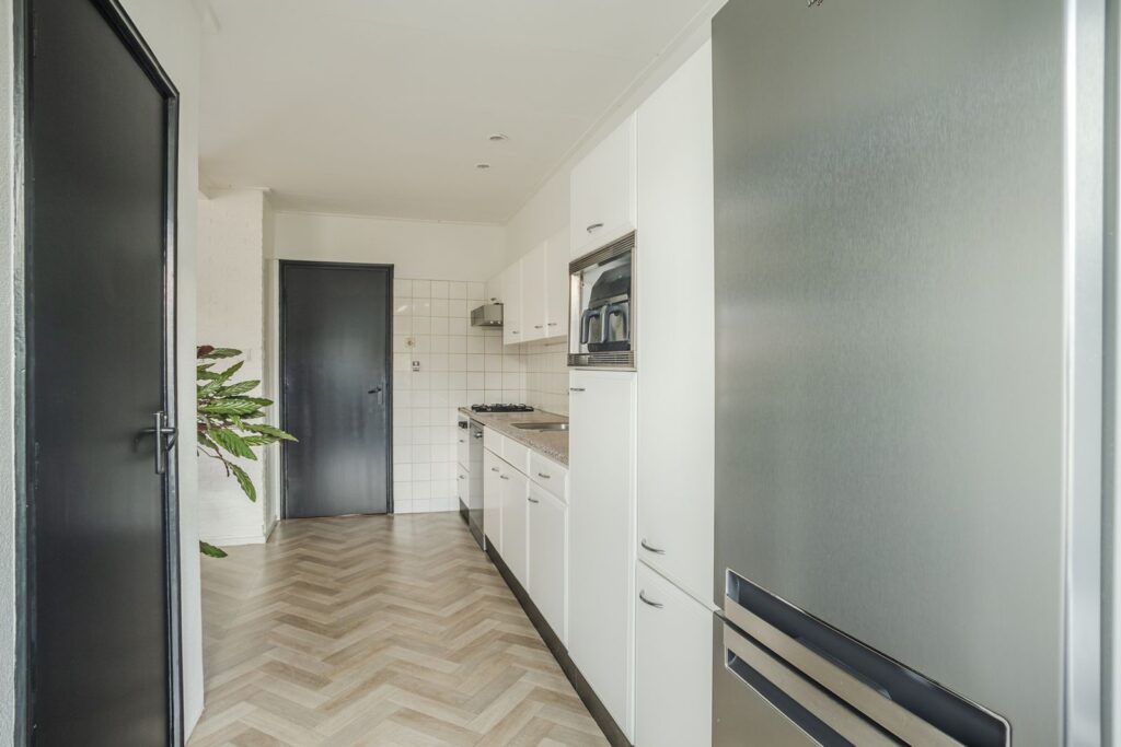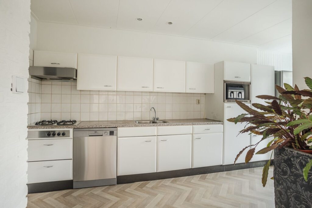 De open keuken is opgesteld in een recht blok en voorzien van een gaskookplaat, vaatwasser (RVS), losse koelkast en aansluitingen voor wasmachine en droger.