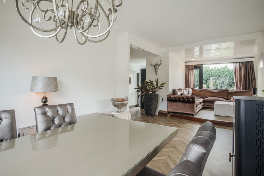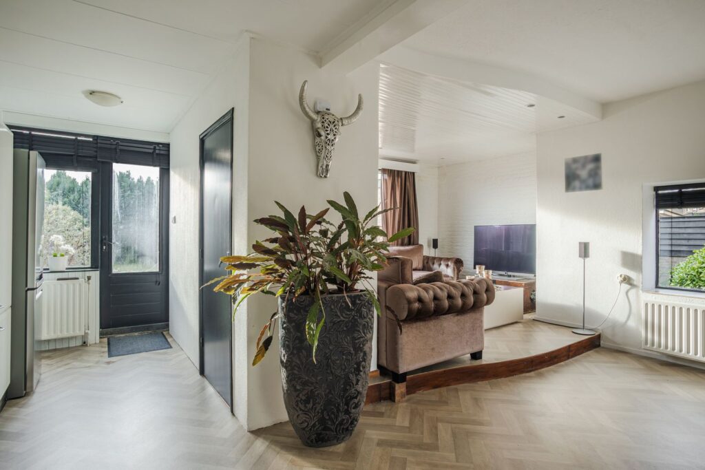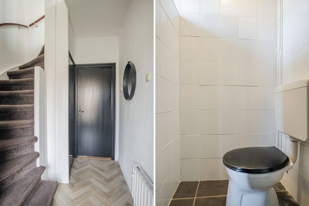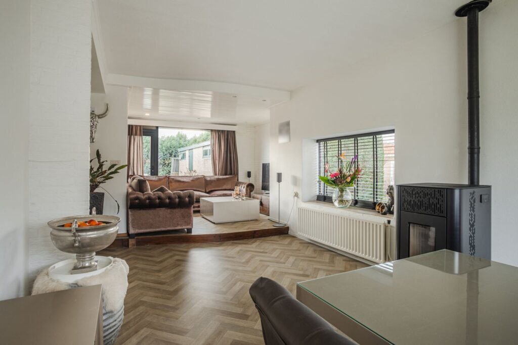 Begane grond: Via de entree bereik je de hal met toilet, meterkast en een verdiepte trapkast. De woonkamer is licht en sfeervol, met een speelse indeling waarbij de zithoek deels verhoogd is vanwege de aanwezigheid van de kelder. De pelletkachel zorgt hier voor extra warmte en gezelligheid.