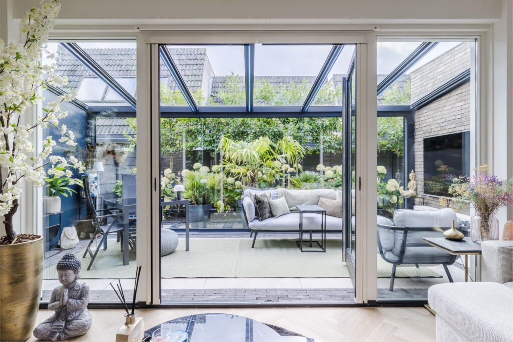 This home has been finished to perfection and features a spacious living room, high-quality kitchen, wellness bathroom, office space, and a conservatory with lighting and sunshades — a wonderful additional living area that can be enjoyed year-round.