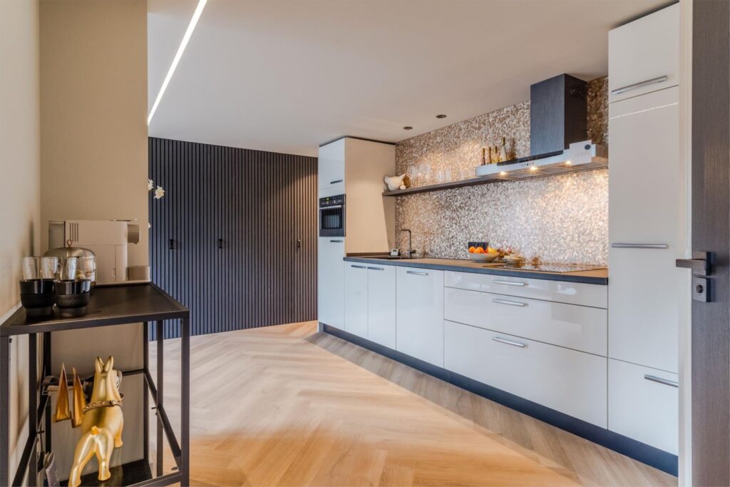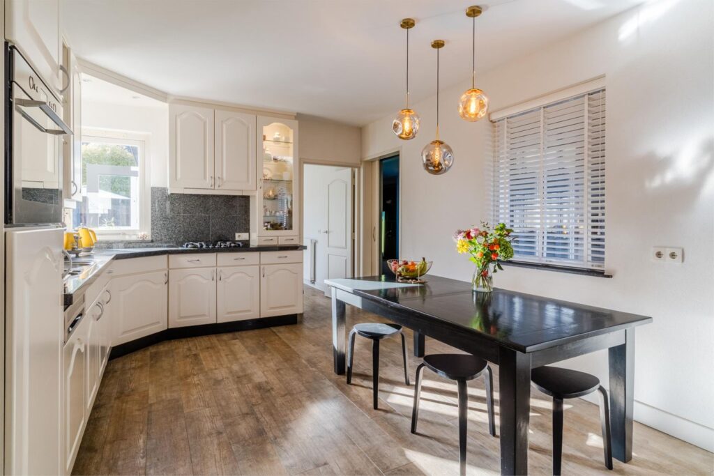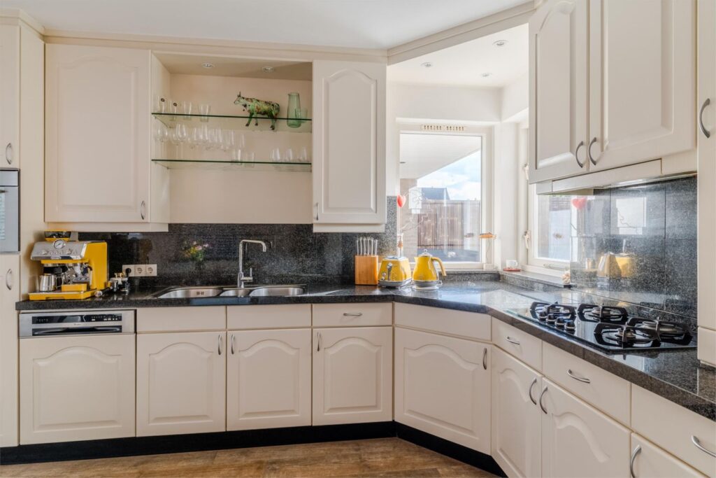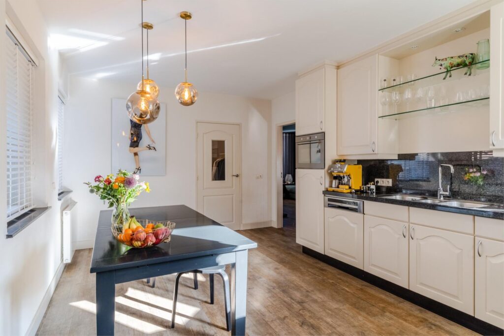 Vanuit de hal kom je direct de landelijk ogende woonkeuken binnen. De keuken is in hoekopstelling geplaatst en voorzien van een granieten aanrechtblad, diverse inbouwapparatuur zoals een vaatwasser, combimagnetron, dubbele spoelbak, afzuigkap en 4-pits gasfornuis. Verschillende ramen zorgen voor een mooie lichtinval. In deze ruimte is vloerverwarming aanwezig.