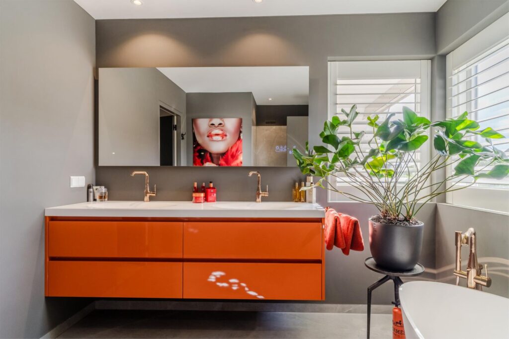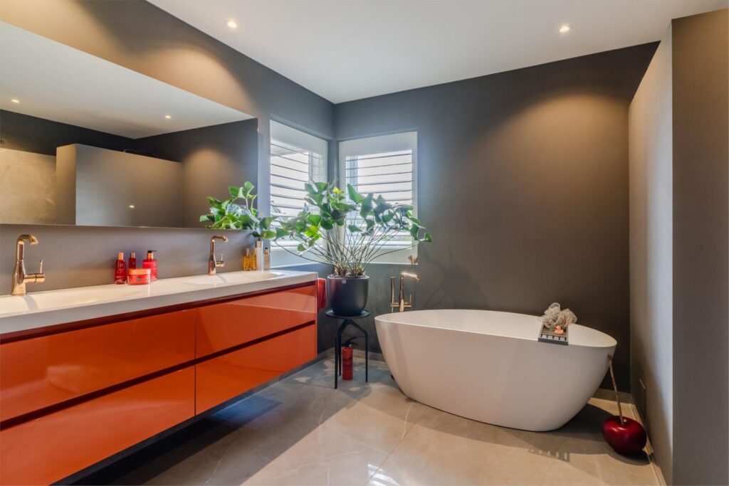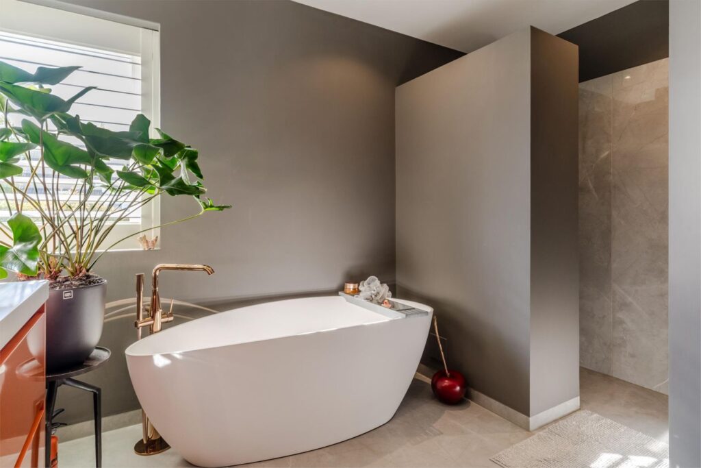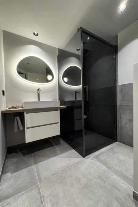 De vloer in de badkamer is betegeld met 2 Italiaanse slaps, zodat de hele vloer alleen maar 1 naad heeft! De douchevloer en wanden zijn met slaps betegeld. De wanden in de overige ruimte van de badkamer zijn glad gestukt. Er is een exclusief vrijstaand ligbad aanwezig. In deze badkamer is vloerverwarming aanwezig. Het toilet bevindt zich in een aparte ruimte.