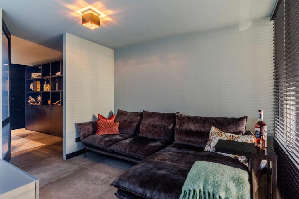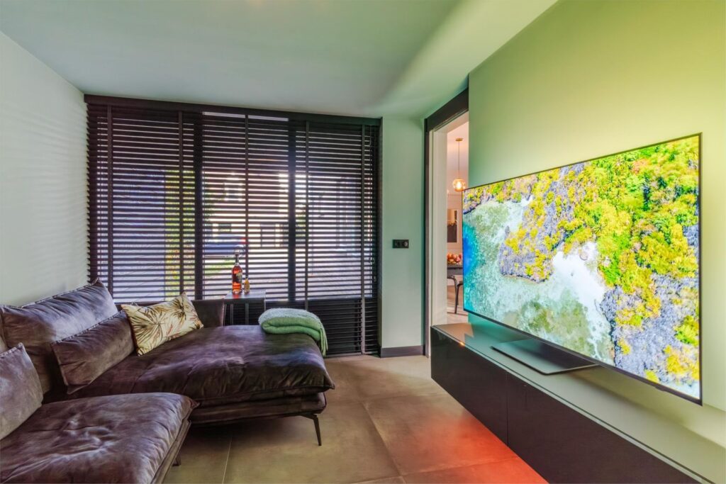 De TV-kamer is toegankelijk door de schuifdeur in de keuken. Deze is afgewerkt met een tegelvloer en biedt ook prima plek om uit te rusten.