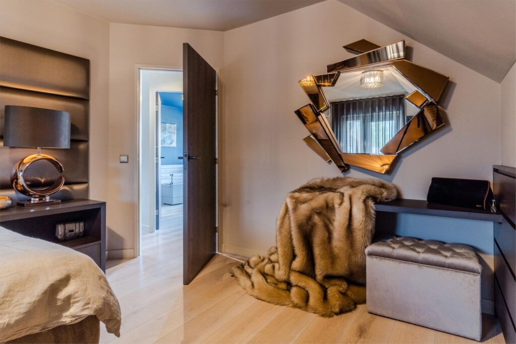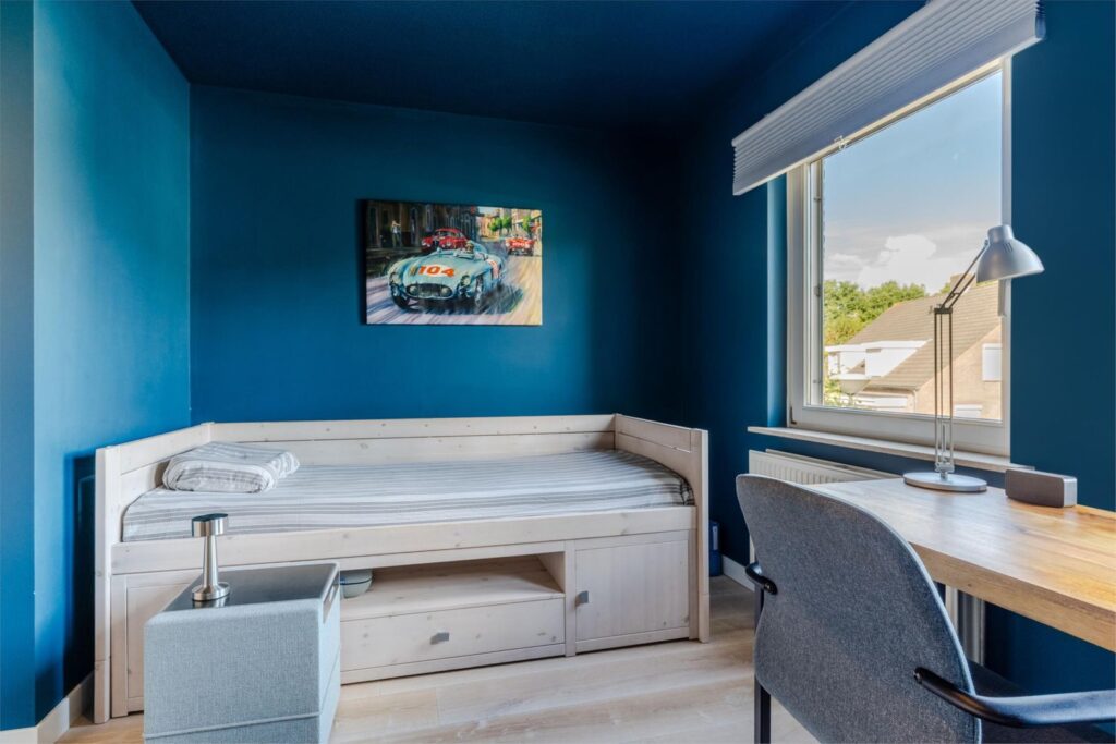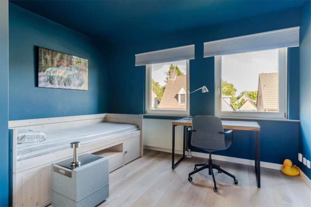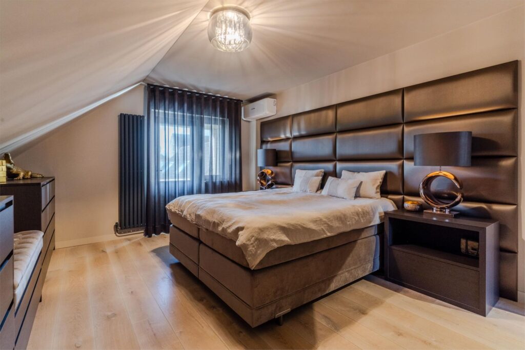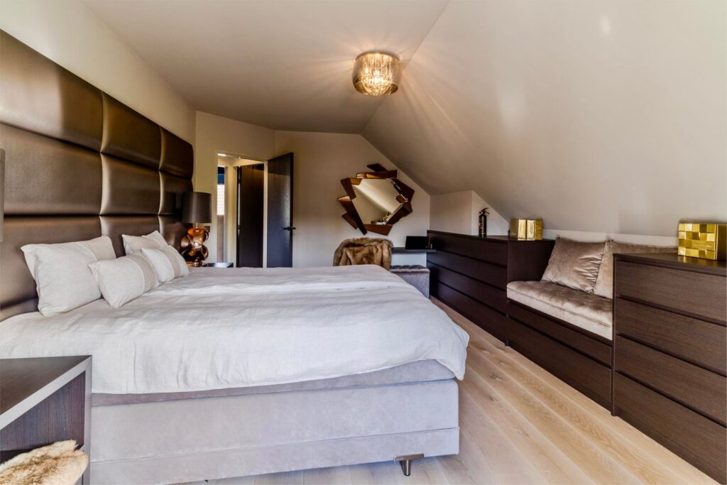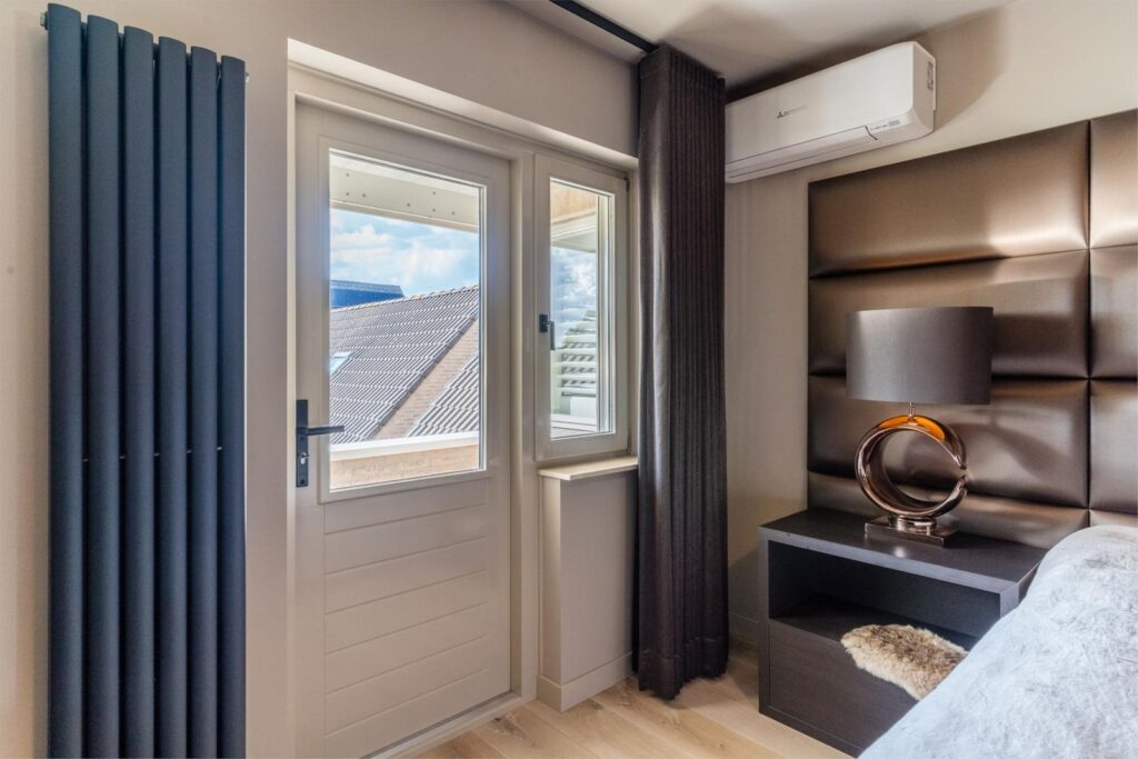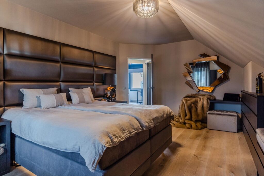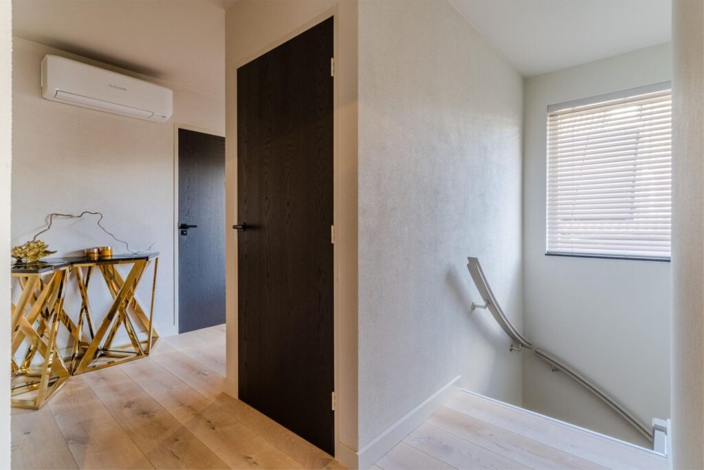 3 slaapkamers en de overloop zijn allen afgewerkt met een houten vloer, die doorloopt naar alle kamers zonder drempels. De wanden in 2 slaapkamers zijn keurig glad gestukt afgewerkt. De wanden in de derde slaapkamer zijn afgewerkt met behang. De ‘master’ slaapkamer beschikt over een balkon en een airco-unit (die ook gebruikt kan worden om te verwarmen). Tevens is er in deze slaapkamer een op maat gemaakte inbouwkast met zitplaats en make-uptafel aanwezig. De overloop heeft een airco-unit (welke kan koelen en verwarmen) die zorgt om perfecte temperatuur op de hele verdieping inclusief slaapkamers.