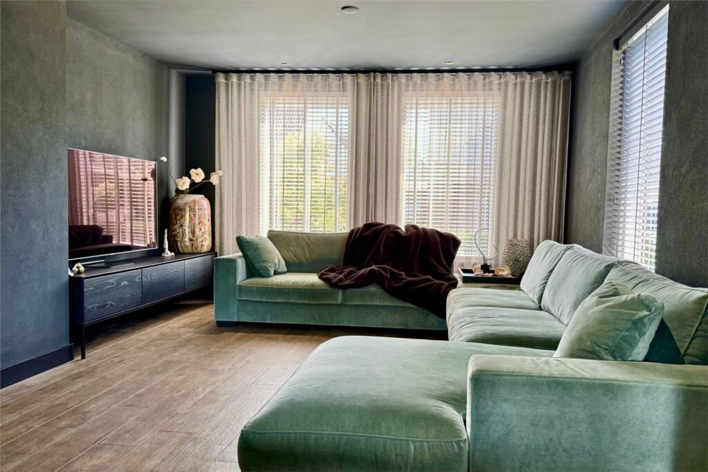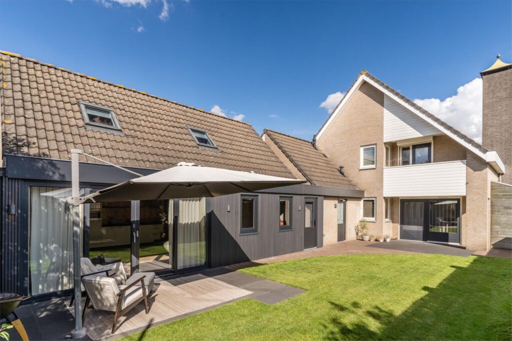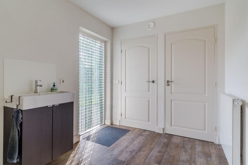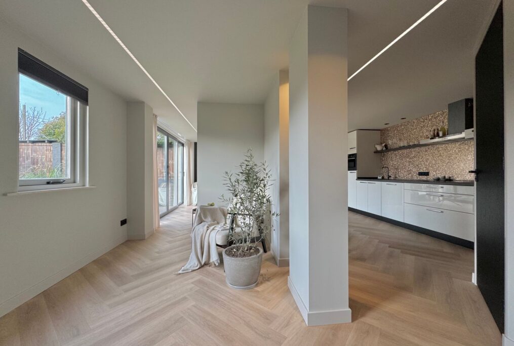 De schuifpui aan de achterzijde zorgt voor een prettige verbinding met de achtertuin. Er is direct achter de schuifpui een overdekt terras. Alle wanden zijn voorzien van stukwerk en afgewerkt met een hoge plint. In deze ruimte is vloerverwarming aanwezig.