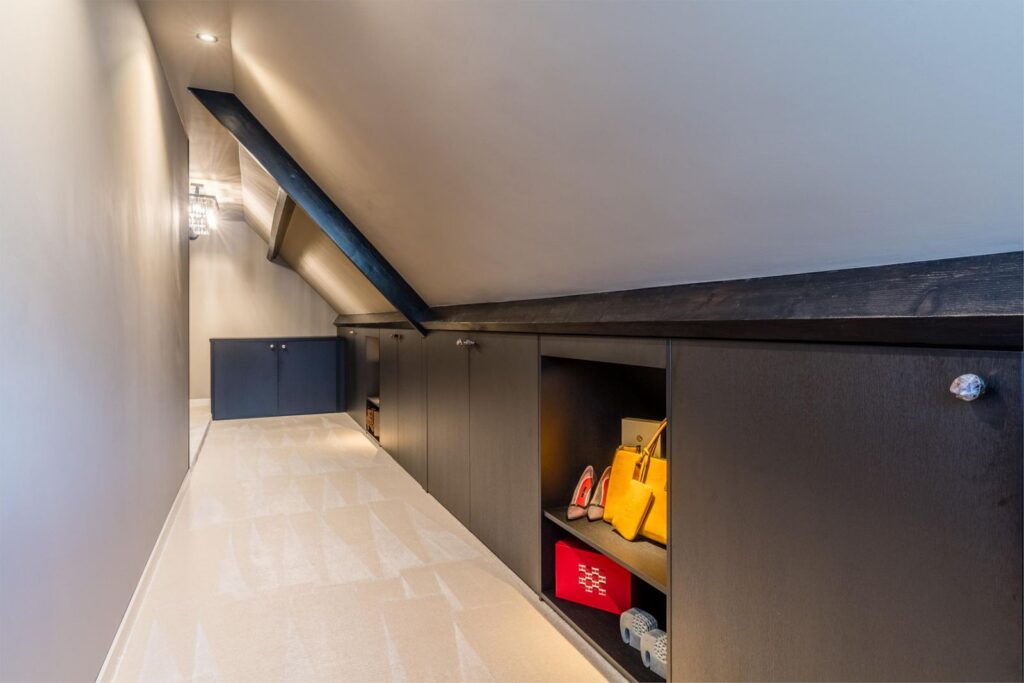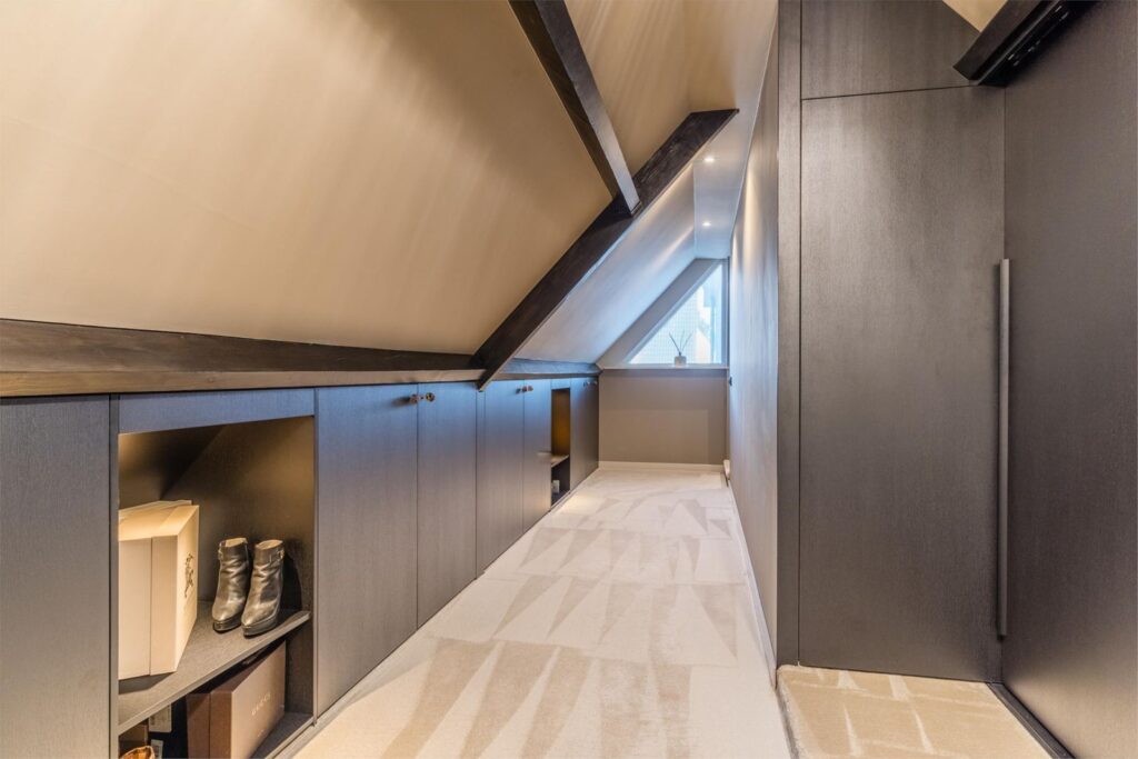 De stijlvolle inloopkast met op maat gemaakte kasten geeft veel ruimte voor de kleding, tassen en schoenen. De wasmachine, de droger en Cv-ketel zijn buiten zicht geplaatst in de ontworpen kasten. In deze ruimte is vloerverwarming aanwezig.