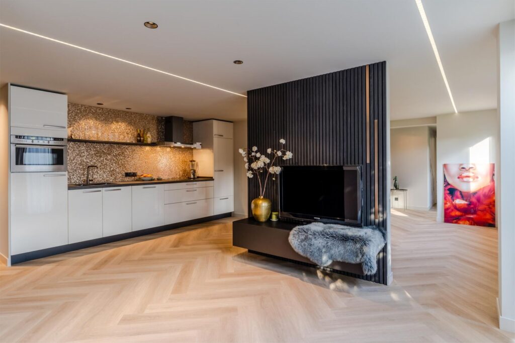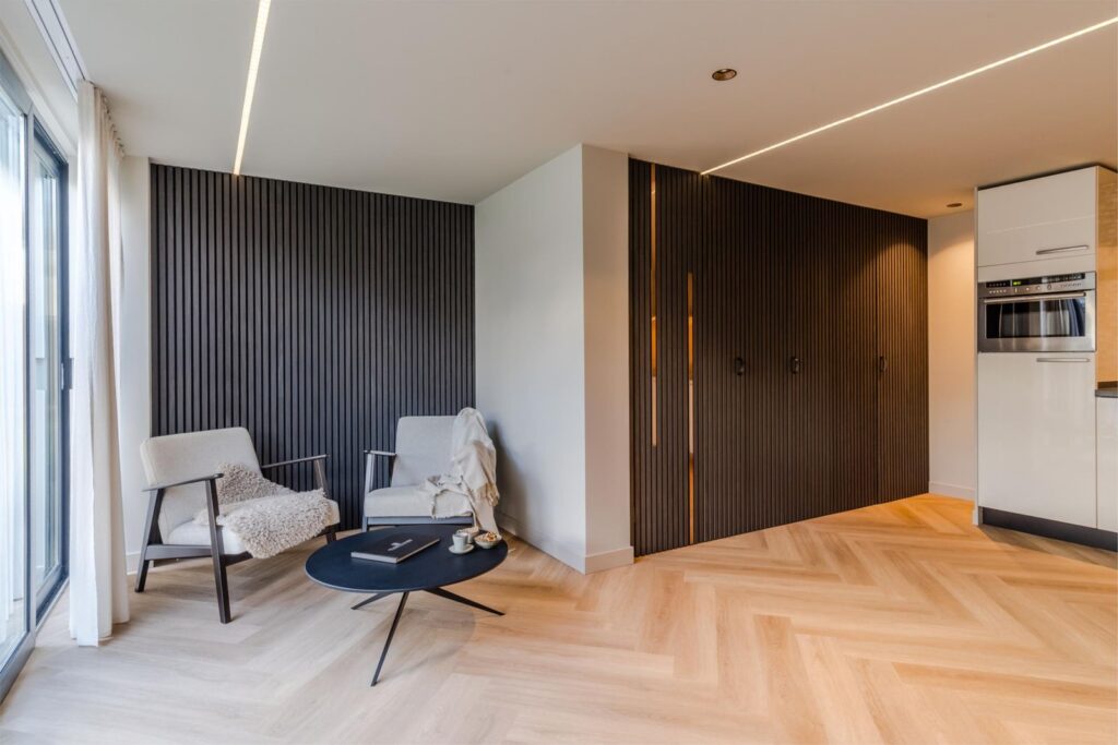 Begane grond is afgewerkt met een visgraat-PVC-vloer.