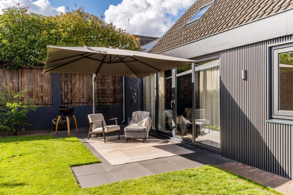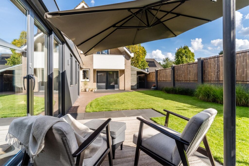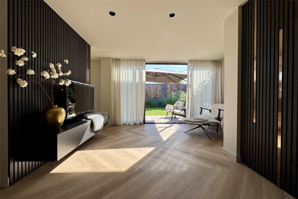 Vanuit de woonkamer kan men door de grote schuifpui de tuin in.