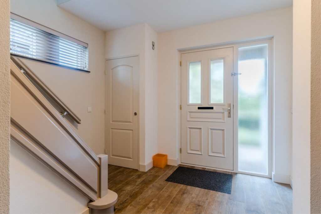 Met een eiken trap naar de eerste etage waaronder zich een fijne kelder bevindt heb je een praktische opbergmogelijkheid voor voorraad. Tevens de moderne meterkast met een glasvezelaansluiting. Verder is er een grote hoek voor de garderobe aanwezig. Er ligt een keramische parketvloer die in zijn geheel doorloopt naar de woonkeuken, woonkamer, bijkeuken en het toilet. De wanden zijn gestukt.