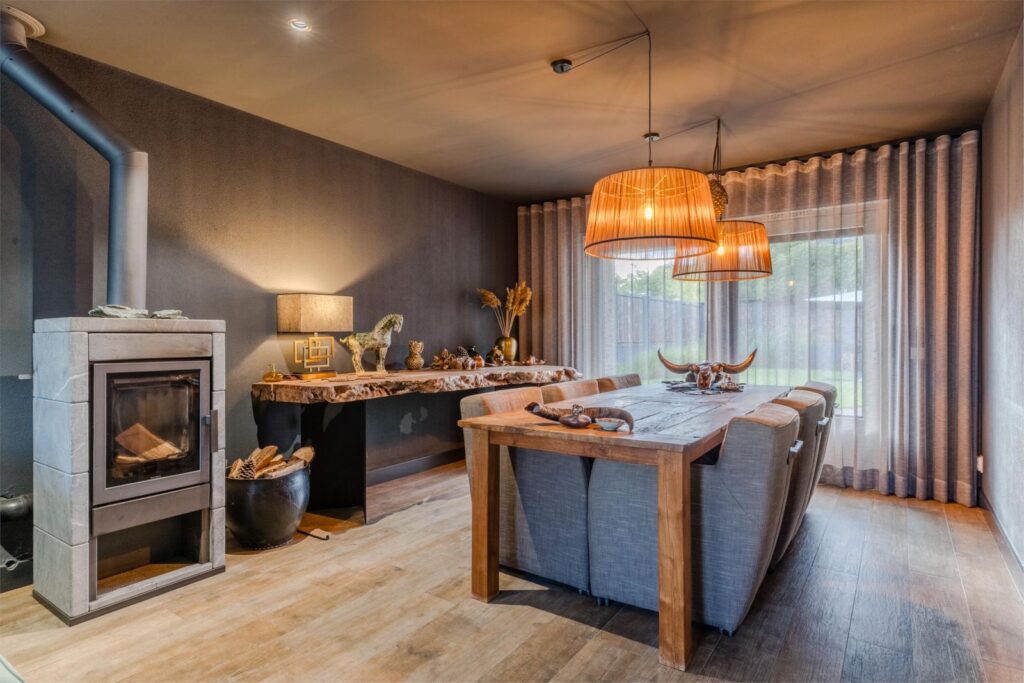 Via de keuken bereik je de ruime, lichte doorzonwoonkamer met een sfeervolle speksteen-houtkachel.