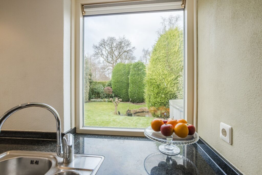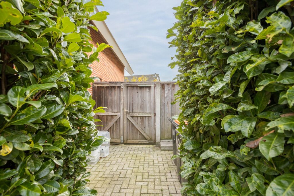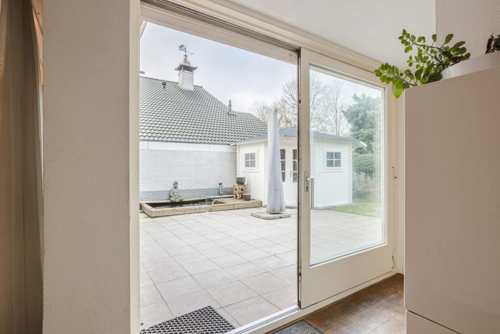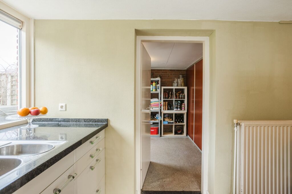 Aangrenzend bevindt zich de bijkeuken/berging met aansluitingen voor wasmachine en droger, extra bergruimte en toegang naar buiten.