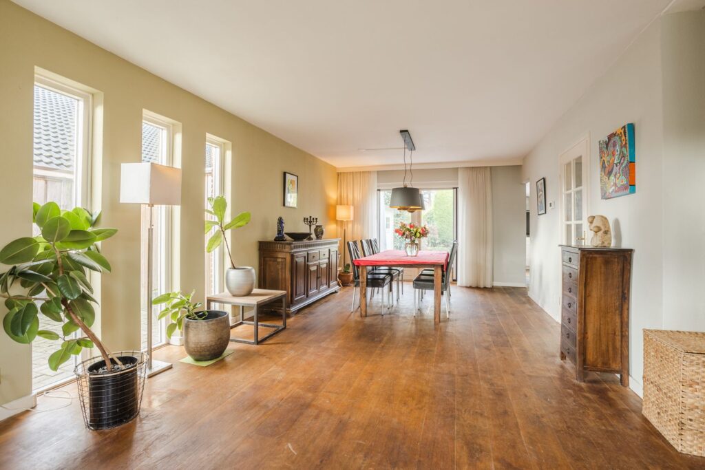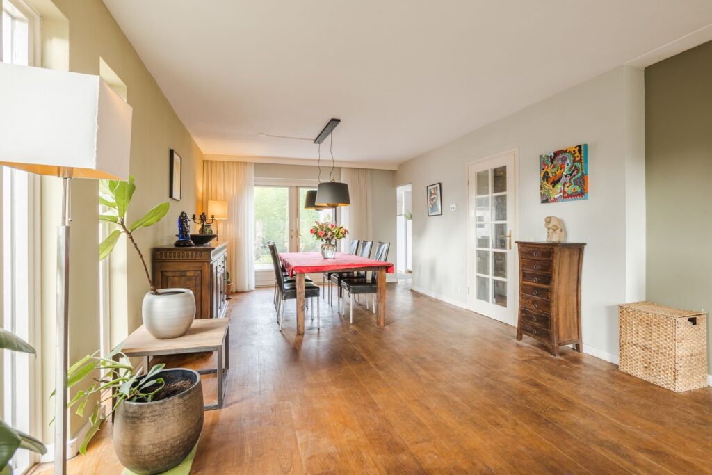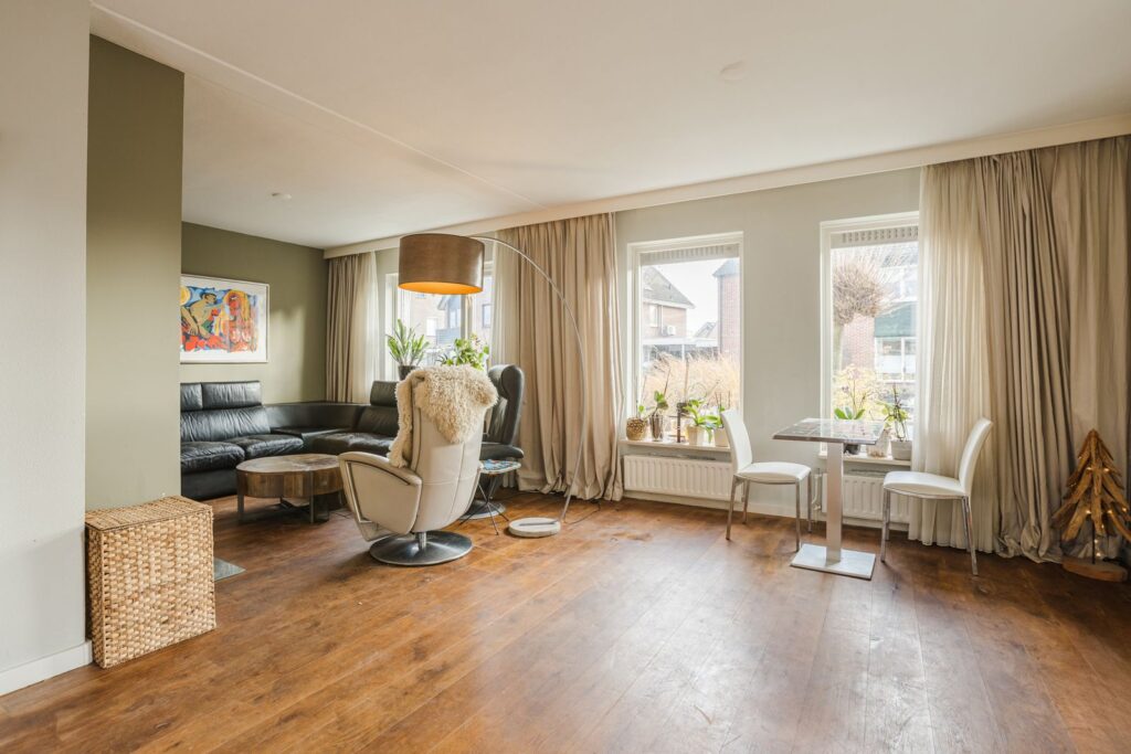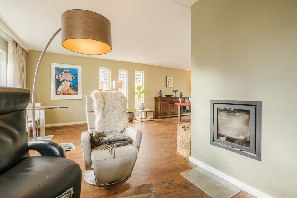 De ruime woonkamer is licht en sfeervol, voorzien van een houten vloer en een moderne inbouwhaard die zorgt voor extra warmte en ambiance. Dankzij de grote raampartijen geniet u hier van veel daglicht en een prettig zicht op de tuin.