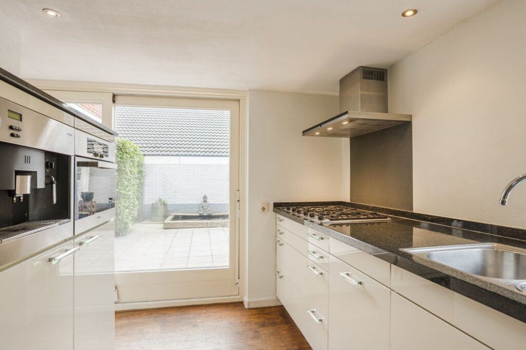 De keuken is strak en modern uitgevoerd met witte fronten, een donker werkblad en diverse inbouwapparatuur, waaronder een gaskookplaat, afzuigkap, oven en koffiemachine. Vanuit de keuken is er directe toegang tot het terras en de tuin.