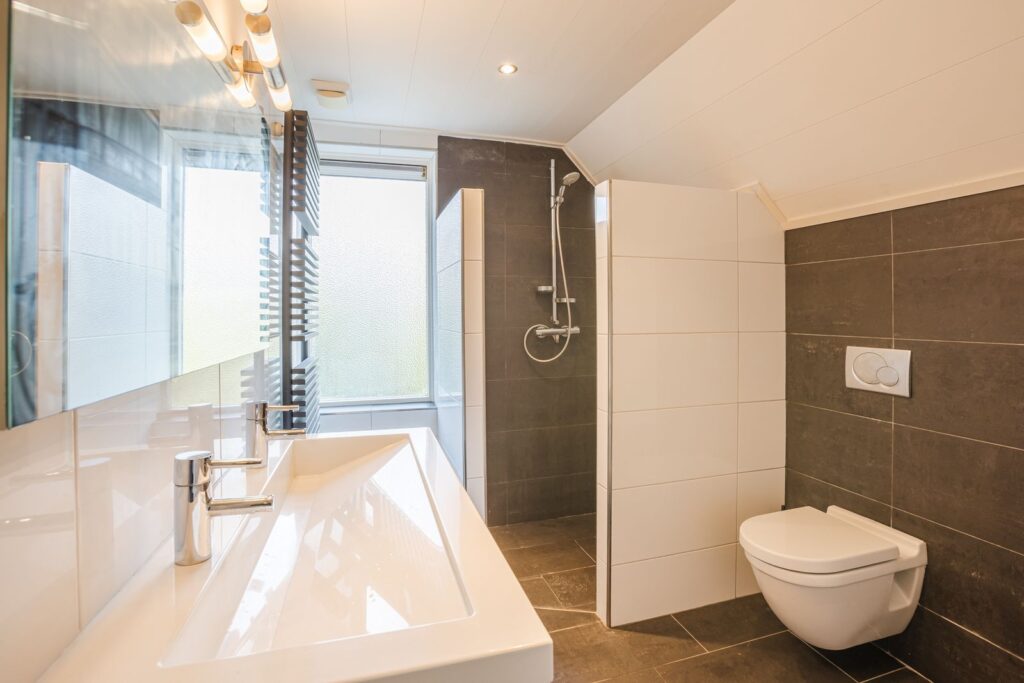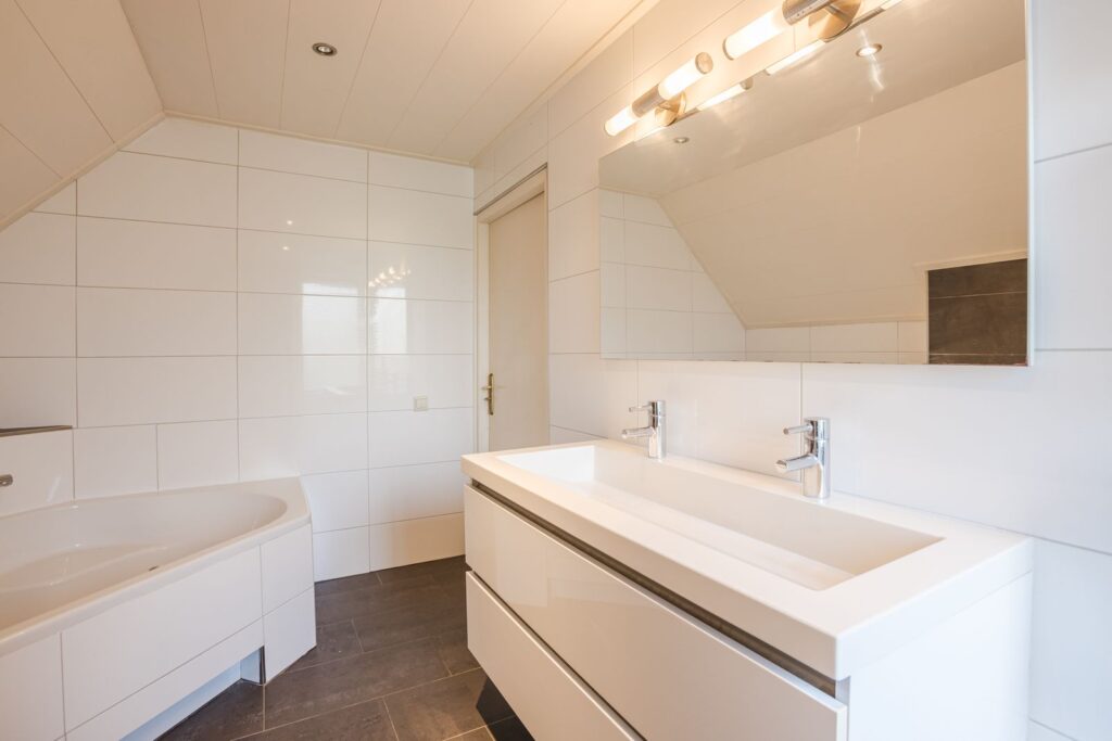 De badkamer is modern en compleet uitgevoerd met een ligbad, inloopdouche, wastafelmeubel en toilet.