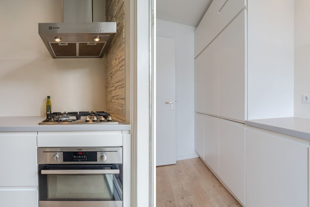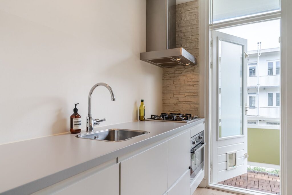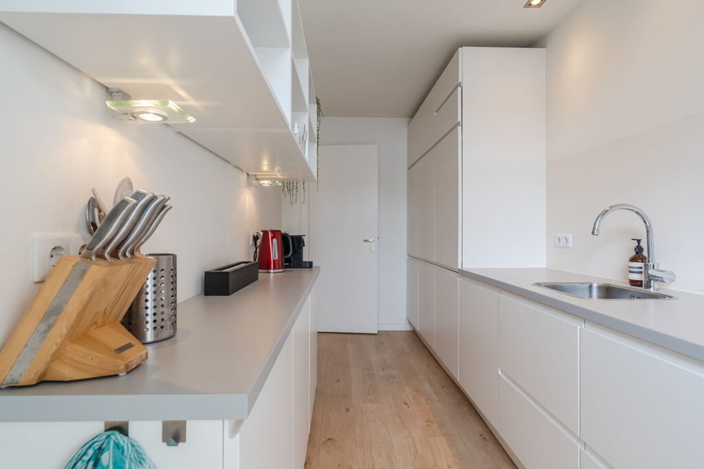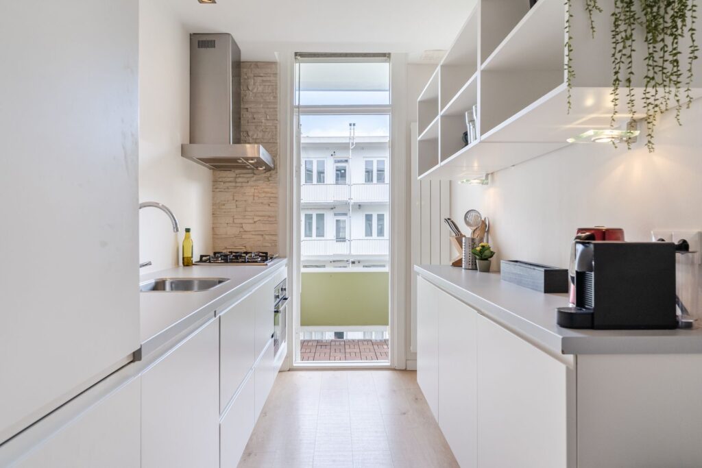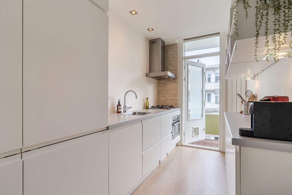 De keuken bevindt zich aan de achterzijde en is praktisch ingericht, voorzien van diverse inbouwapparatuur en veel kastruimte. Vanuit de keuken is het balkon direct toegankelijk.