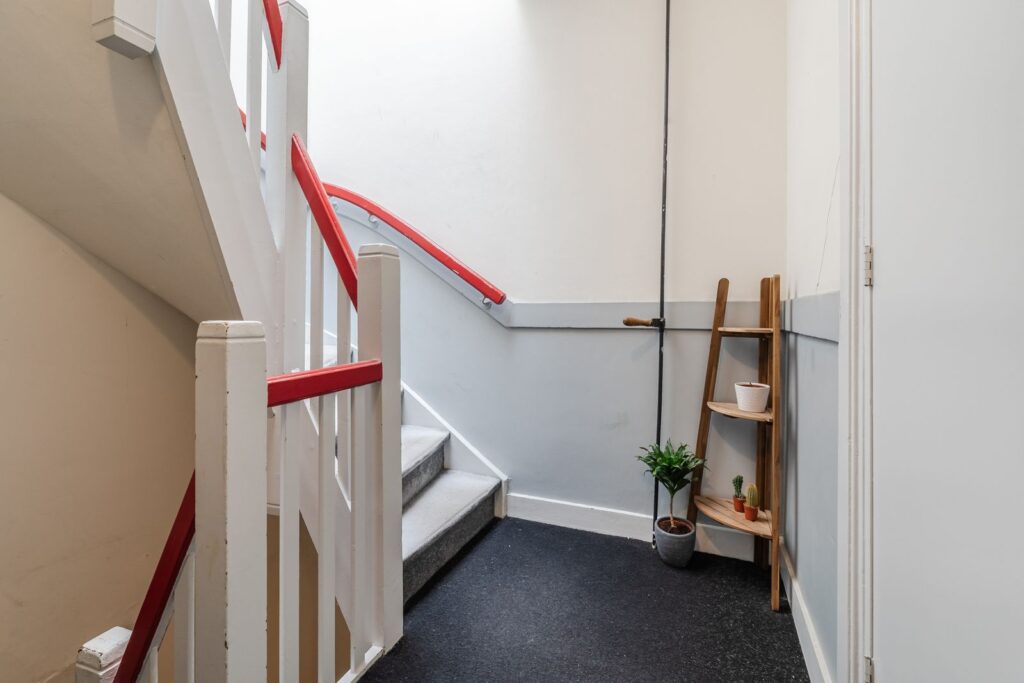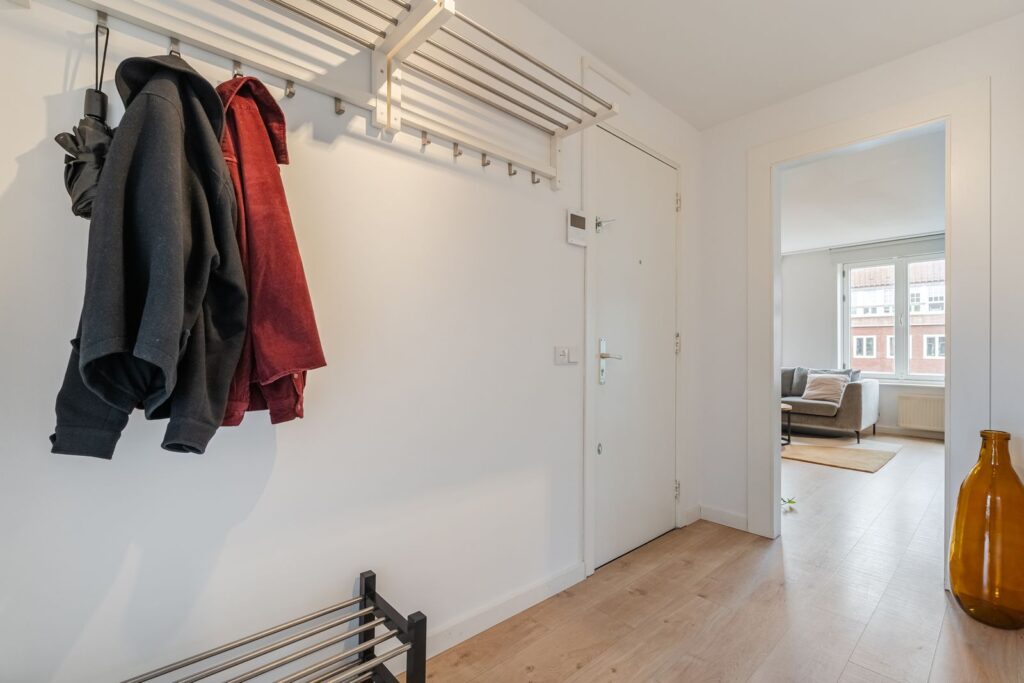 Via het gemeenschappelijke trappenhuis bereik je het appartement op de tweede verdieping. De hal vormt het centrale punt van de woning en geeft toegang tot alle vertrekken.