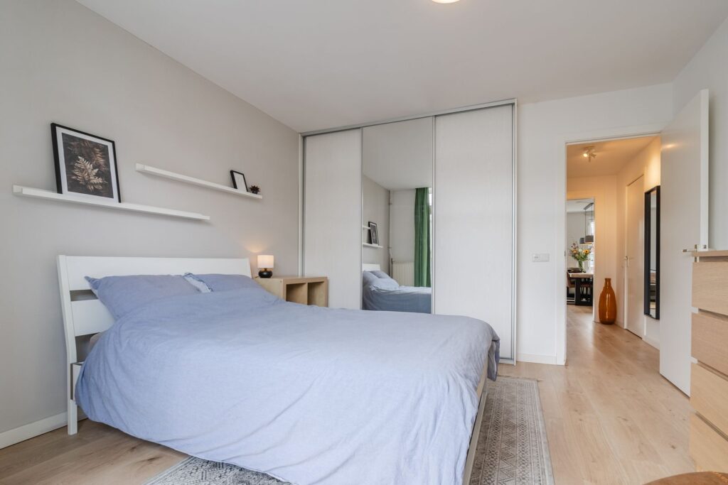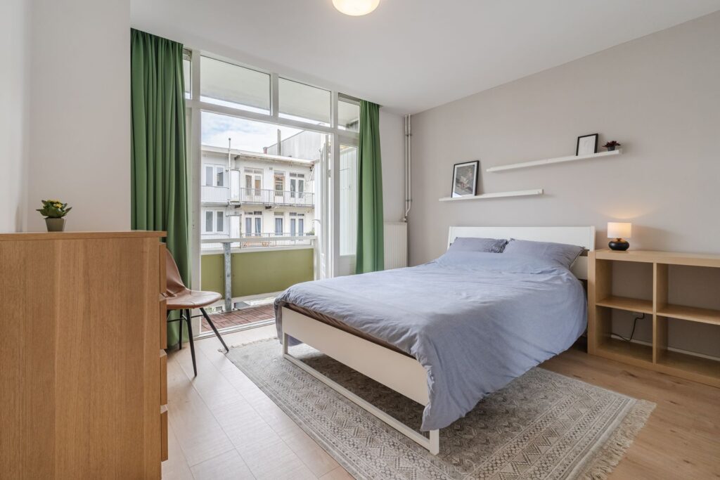 De ruime slaapkamer, eveneens aan de achterzijde, biedt plaats aan een groot bed en ingebouwde kastruimte. Via openslaande deuren bereik je het woningbrede balkon met uitzicht op de binnentuin.