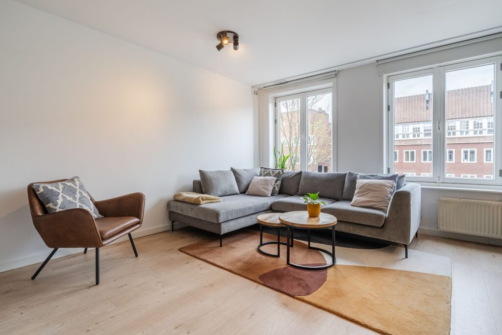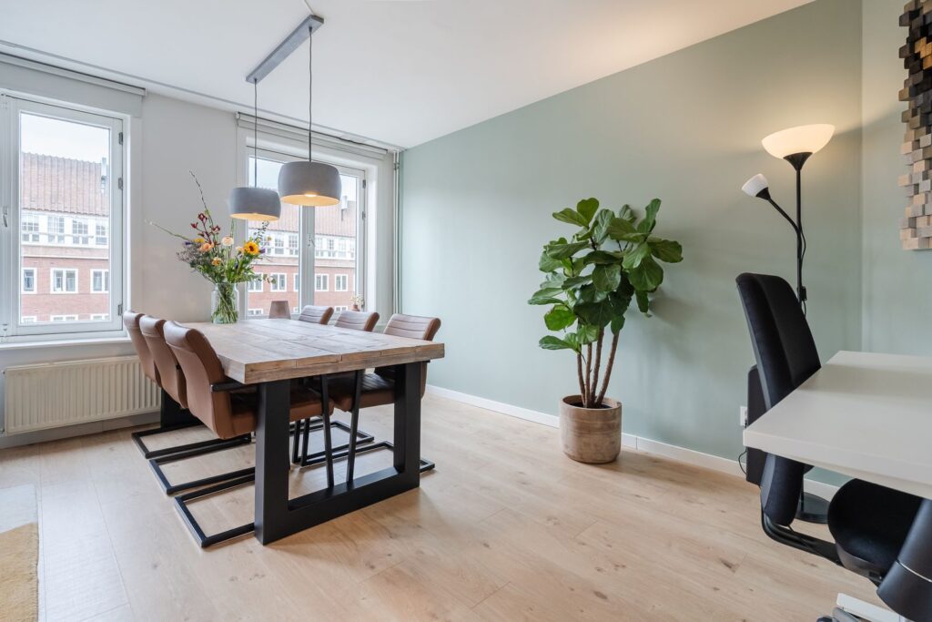 At the front of the apartment is the spacious and bright living room, with windows spanning the full width of the property. This creates abundant natural light and a sense of space. From the living room you have an unobstructed view towards the lively Mercatorplein. The extra-thick windows ensure that passing traffic and public transport are barely audible.