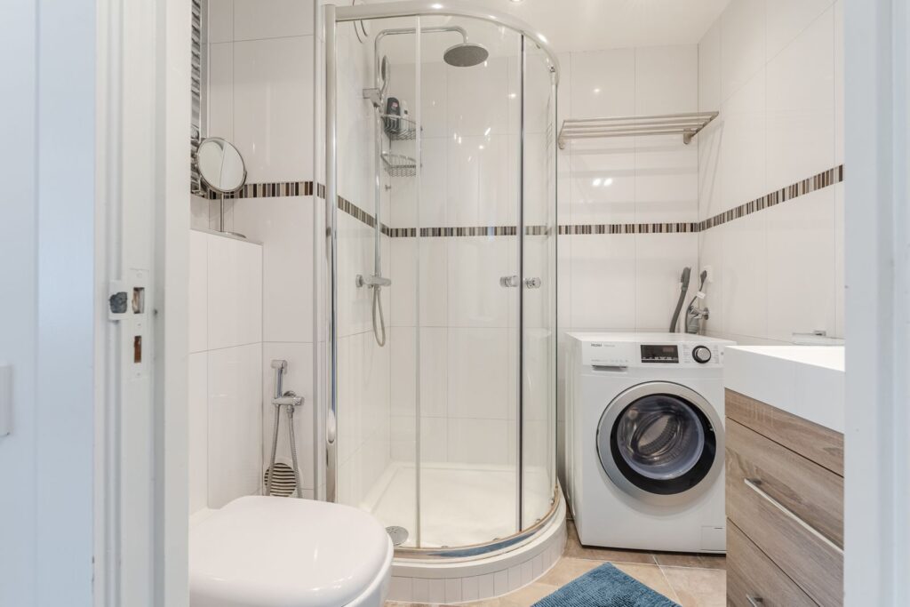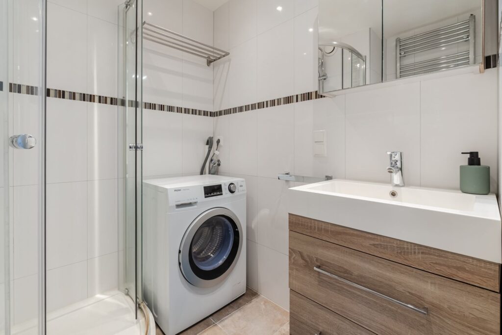 De badkamer is uitgevoerd met regendouche, wastafelmeubel, toilet en ruimte voor een wasmachine.