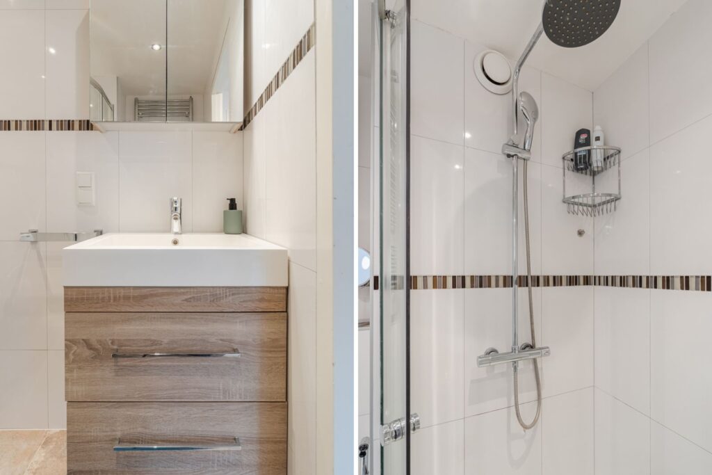 The bathroom is fitted with a rain shower, sink, toilet and space for a washing machine.