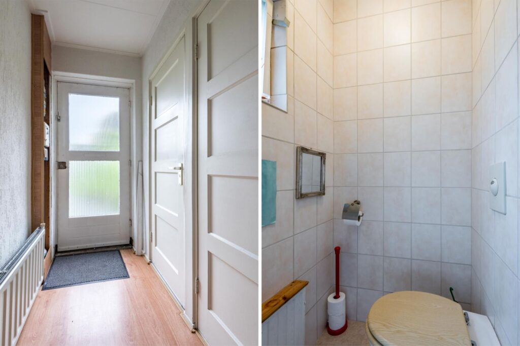 Door het pad in de een lange voortuin met een paar fruitbomen kom je op het terras voor de woning. Via de entree kom je in de gang waar het 1e toilet zich bevindt en een inpandige ruime garderobekast.