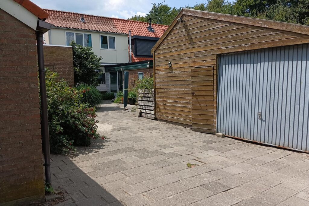 Achter in de tuin staat een grote garage annex schuur met daarachter nog een carport. Dit is allemaal te bereiken door het recht van overpad.