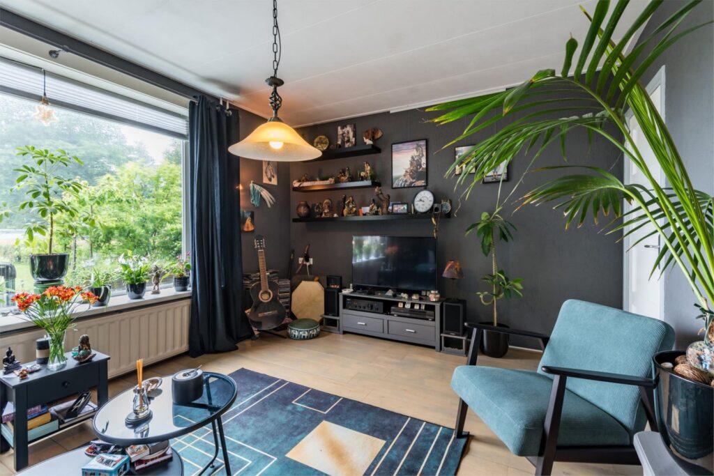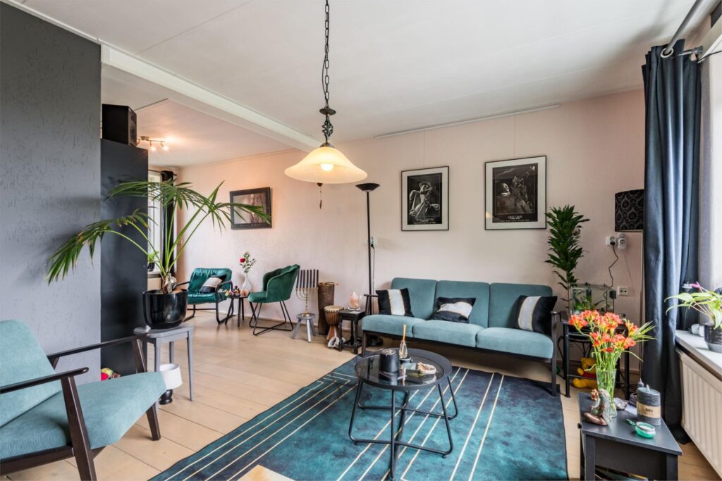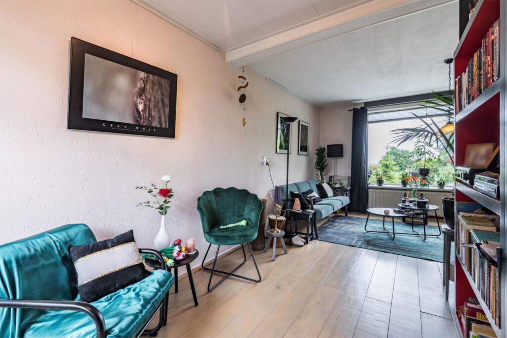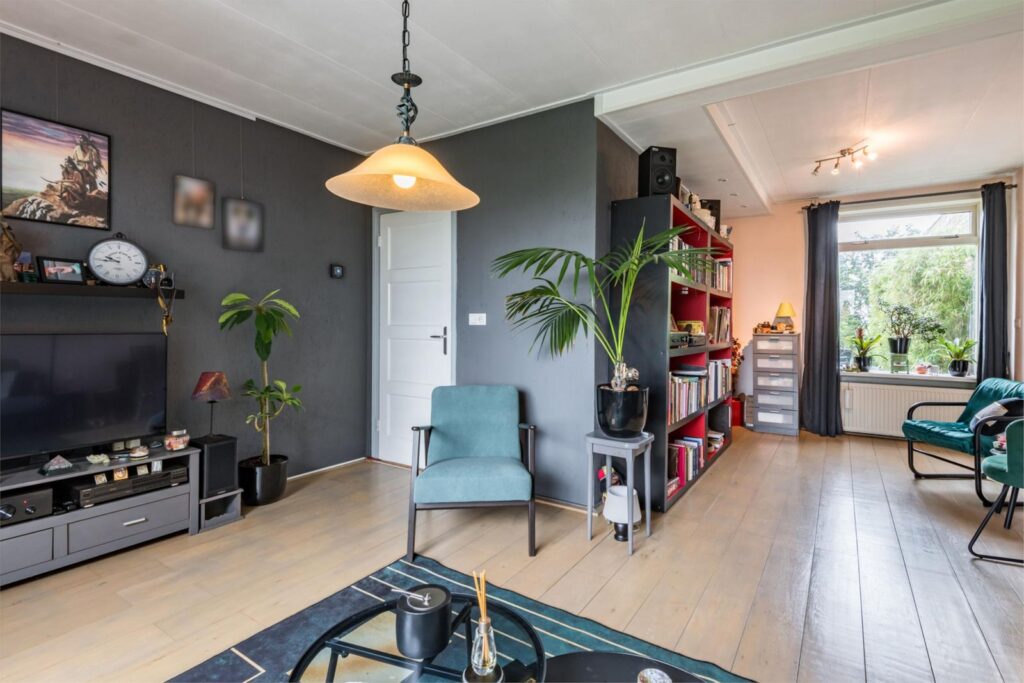 Vanuit de keuken loop je een zonnige/ lichte woonkamer in L-vorm binnen, wat de mogelijkheid schept om verschillende gezellige zitjes te maken. De woonkamer heeft een eiken parketvloer.