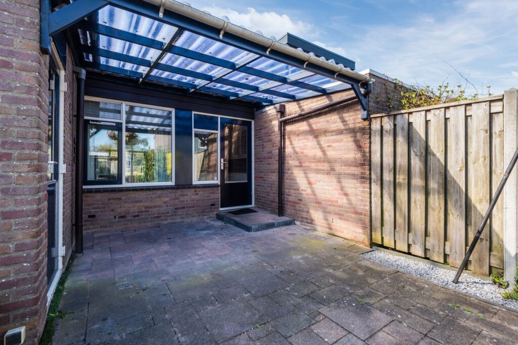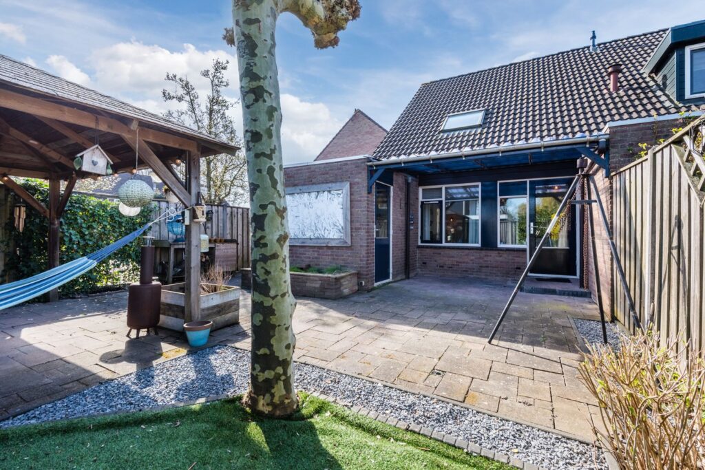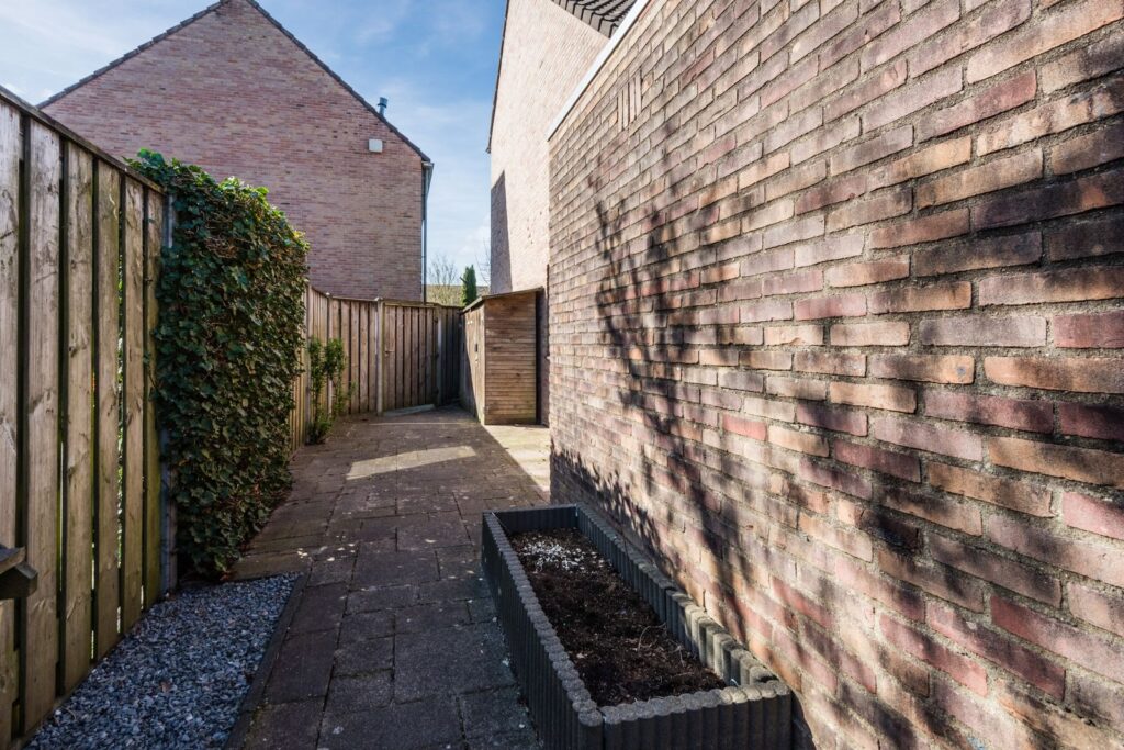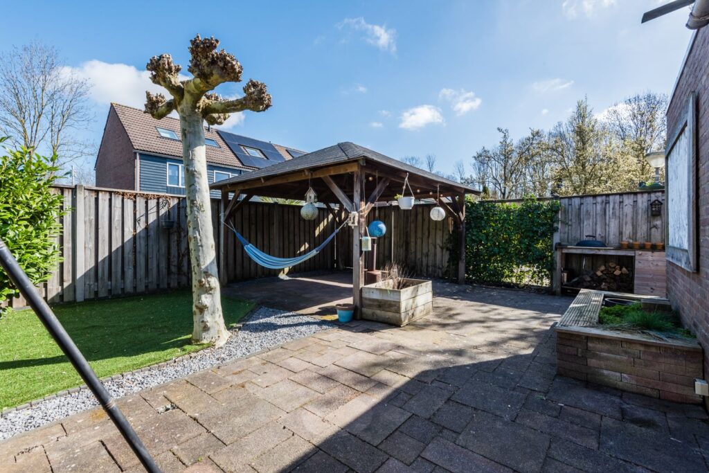 De achtertuin ligt op het noordoosten, en er staat een ruim prieel (3,5*3,5 m) waardoor je hier vaak buiten kunt genieten. De tuin is ingericht met een gazon (kunstgras), een stenen schuur (nieuw dak in 2020), een houten schutting met betonnen palen en een ingang naast het huis. De inrichting van de tuin zorgt voor een degelijke en onderhoudsvriendelijke afwerking.