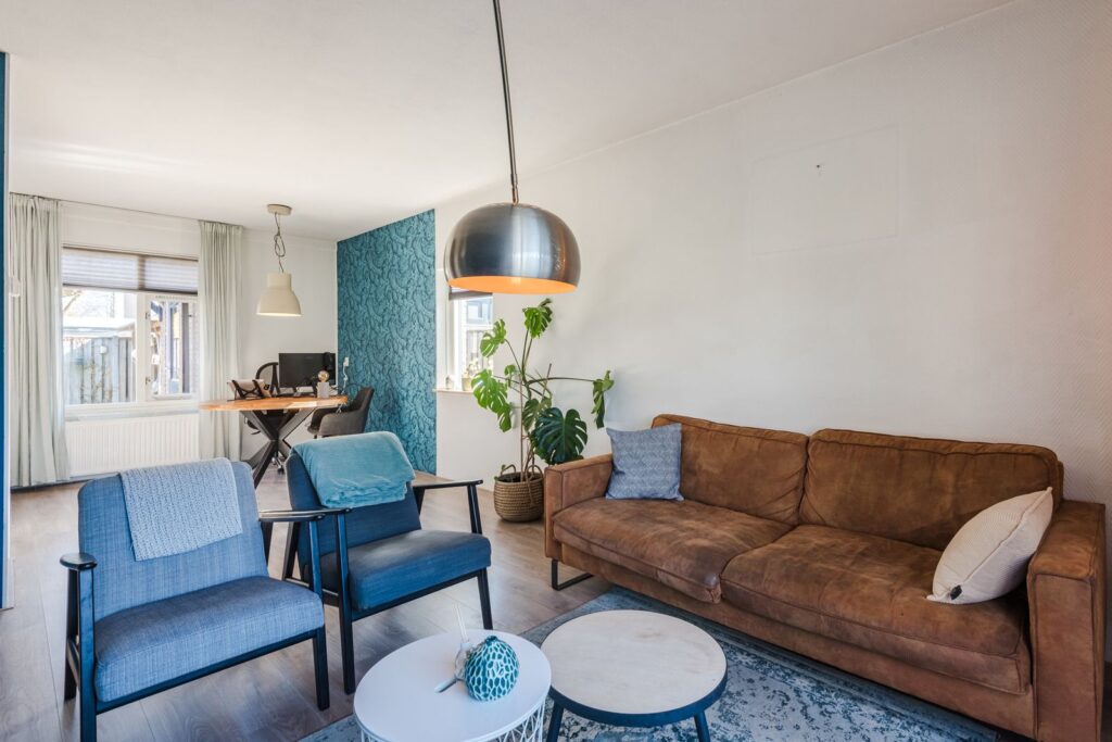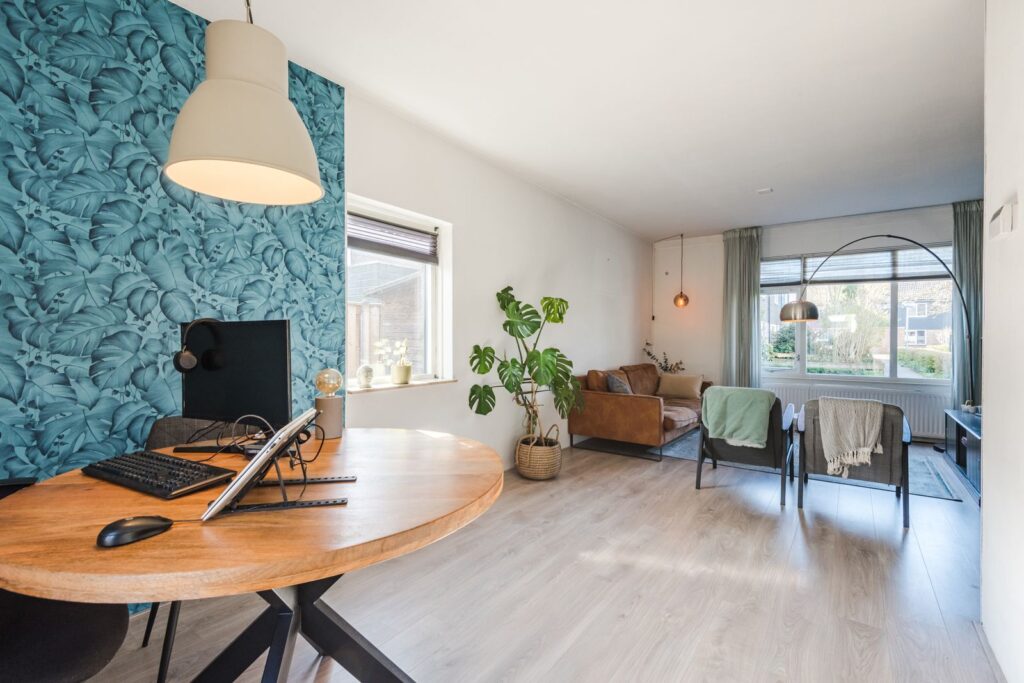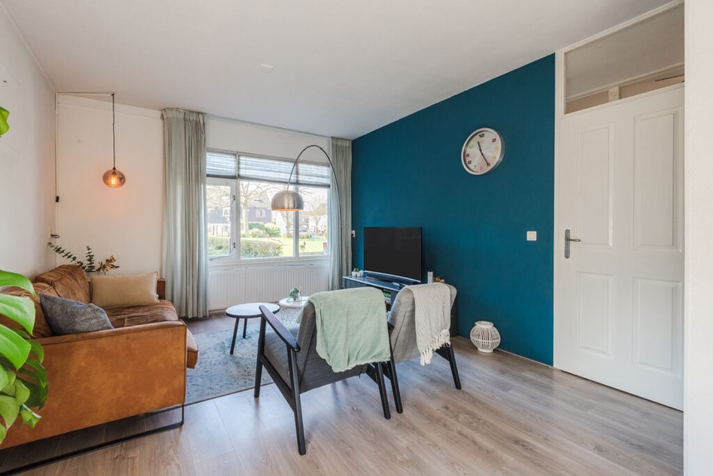 De woonkamer is sfeervol en strak afgewerkt met een laminaatvloer. De ruimte is licht met aan drie zijden ramen en prettig ingedeeld.