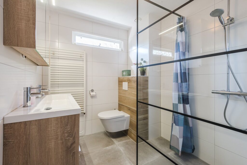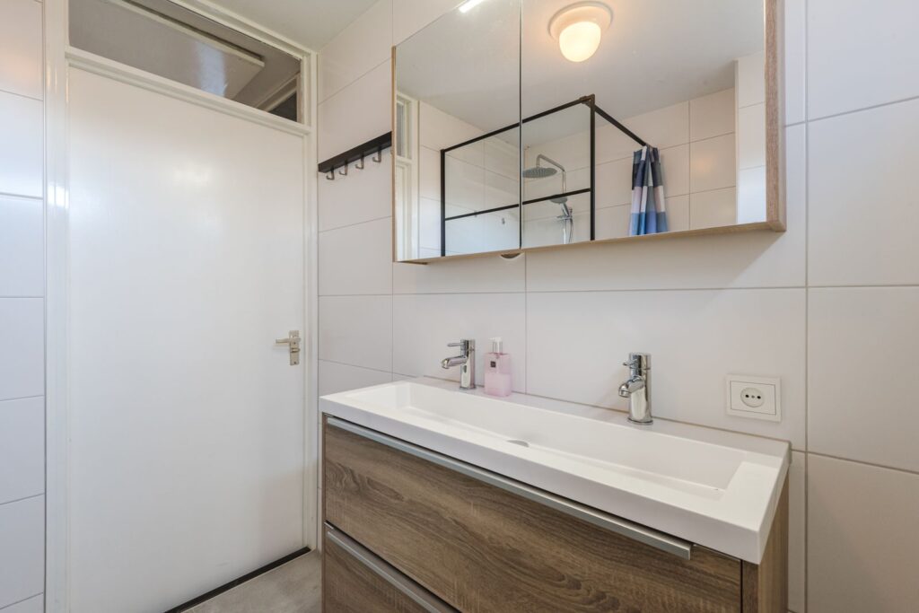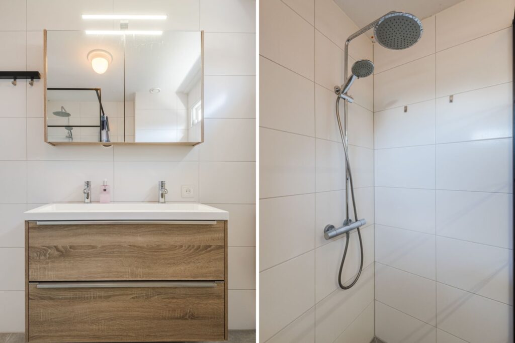 De badkamer (2020) is modern afgewerkt met tegels, een inloopdouche, een wastafelmeubel en een 2e toilet. Er is een raam aanwezig dat geopend kan worden voor natuurlijke ventilatie.