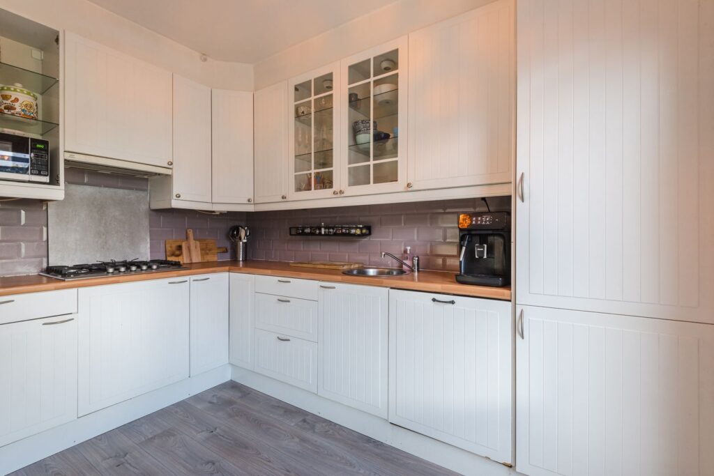De keuken is ruim en voorzien van diverse inbouwapparatuur, waaronder een 5-pits gaskookplaat met afzuiging en vaatwasser. Er is ook een opstelruimte voor de wasmachine.