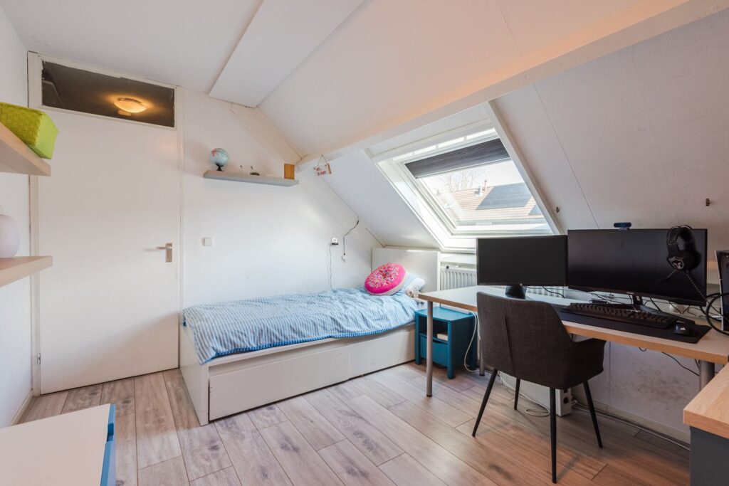 De zolderruimte met laminaatvloer en knieschotten is bereikbaar via een vlizotrap en voorzien van een dakraam. Hier bevinden zich de cv-ketel (Remeha Avanta uit 2019).