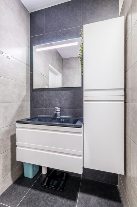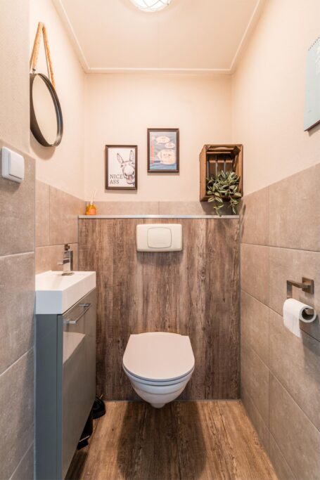 Aan de achterzijde van de woning bevindt zich een royale slaap- of werkkamer met een moderne badkamer ensuite. Deze badkamer is voorzien van een ruime inloopdouche met dubbele douchepaneel, een wastafelmeubel met bijpassende handdoekenkast en extra opbergruimte. Ook is er op de begane grond een aparte wasruimte aanwezig met plek voor zowel wasmachine als droger. Via de achterom komt u in een tweede hal met praktische inbouwkast, ideaal voor extra bergruimte.