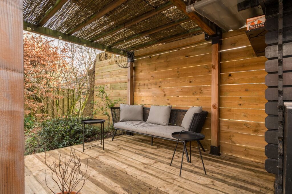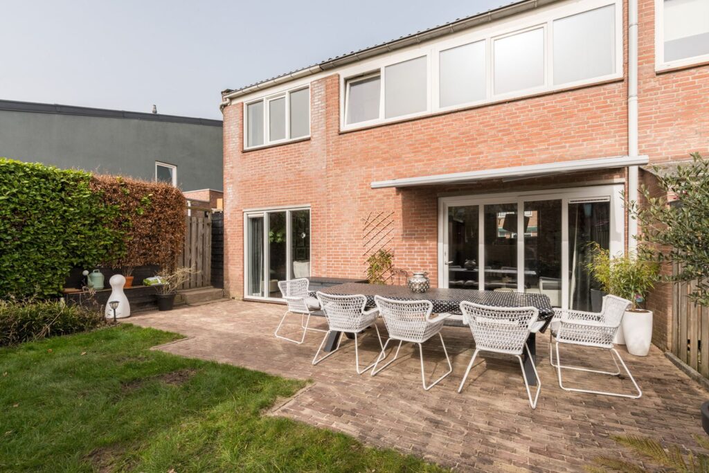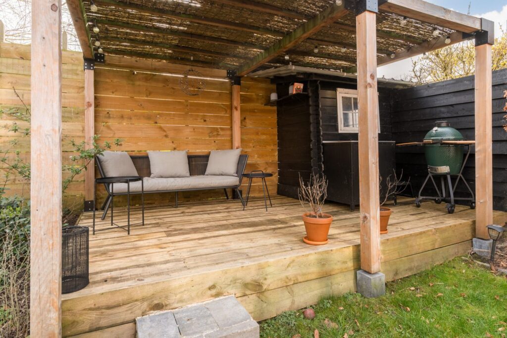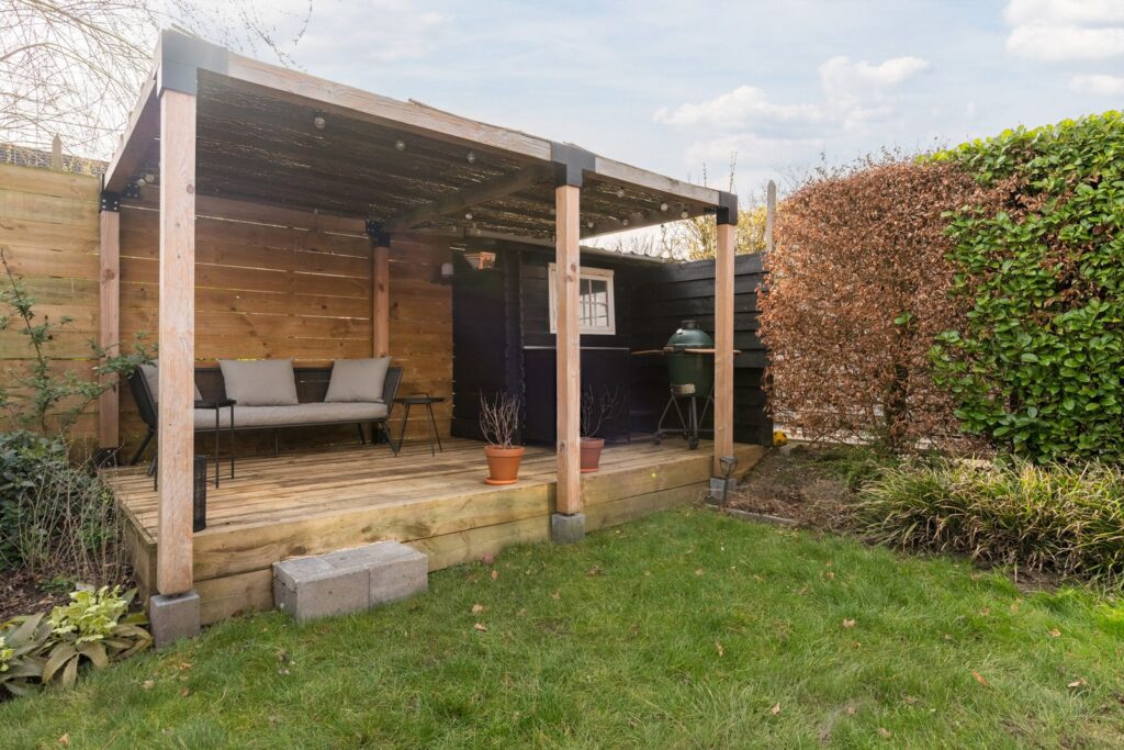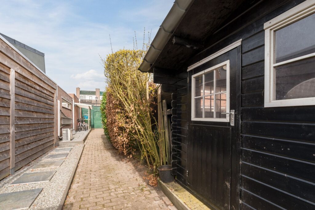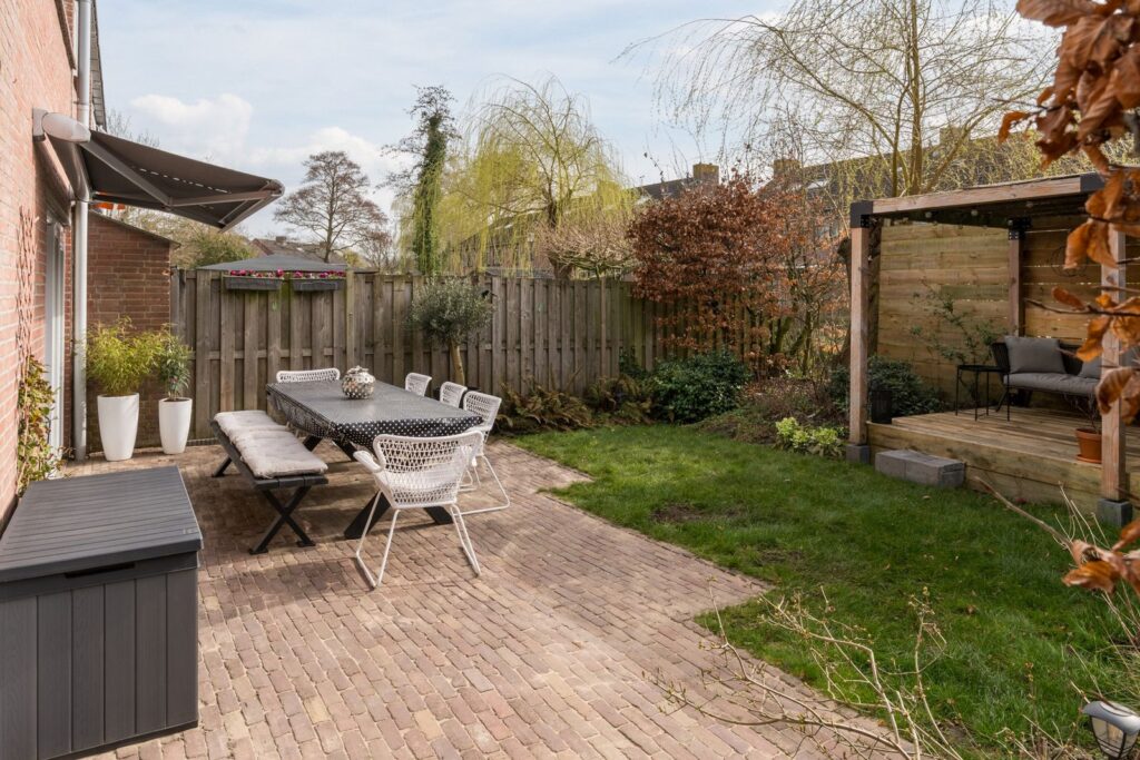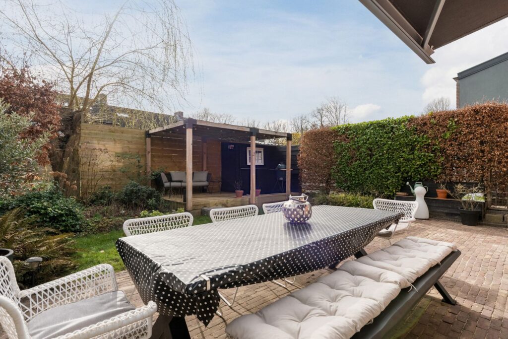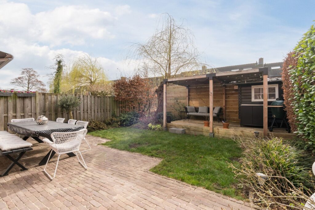 De zonnige achtertuin op het zuiden (ca. 84 m²) biedt veel privacy en is deels bestraat en deels groen aangelegd. De losstaande overkapping creëert een heerlijke extra zitplek. Daarnaast beschikt de tuin over een achterom en een tuinhuisje, bereikbaar via het tuinpad achter de poort.