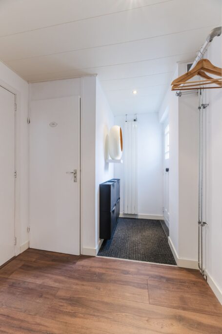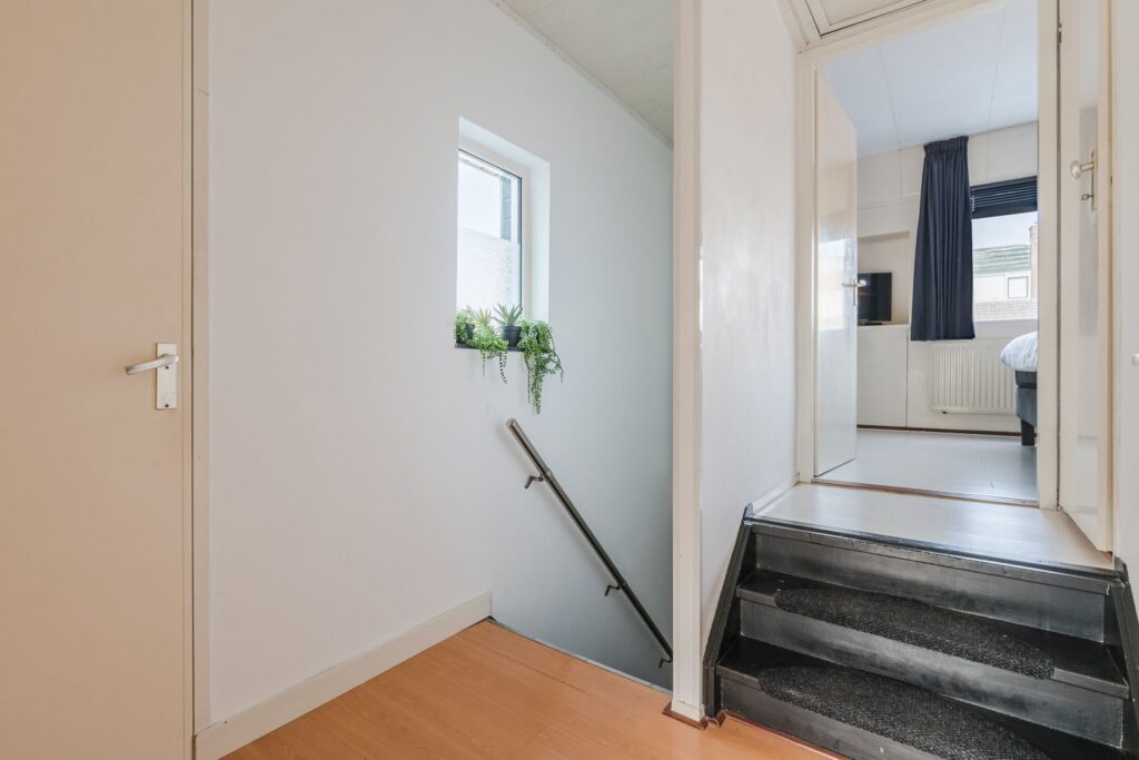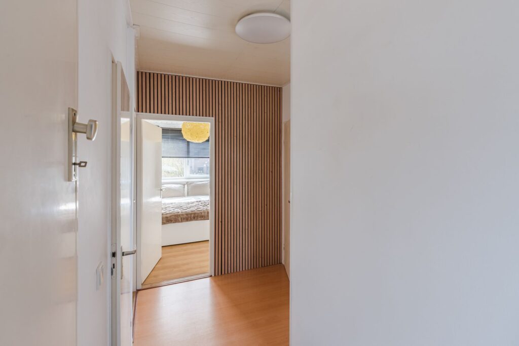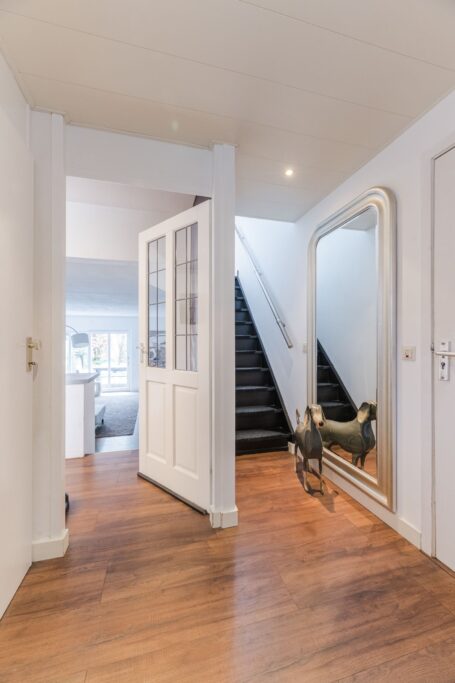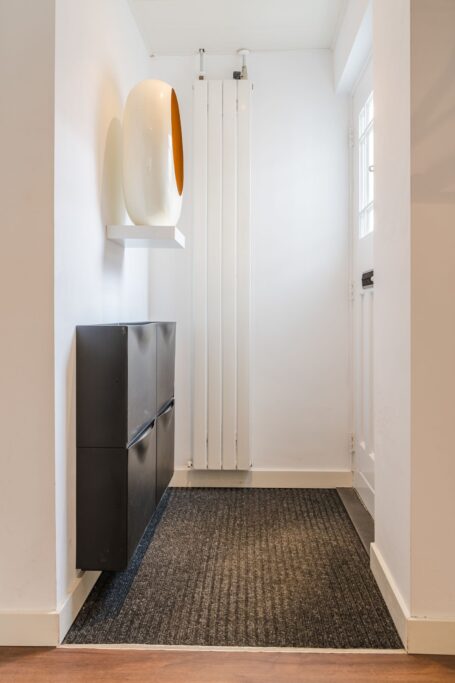 De hal – met vernieuwde en uitgebreide meterkast (2024) – biedt toegang tot de garage, toiletruimte, trapopgang, open keuken en woonkamer.