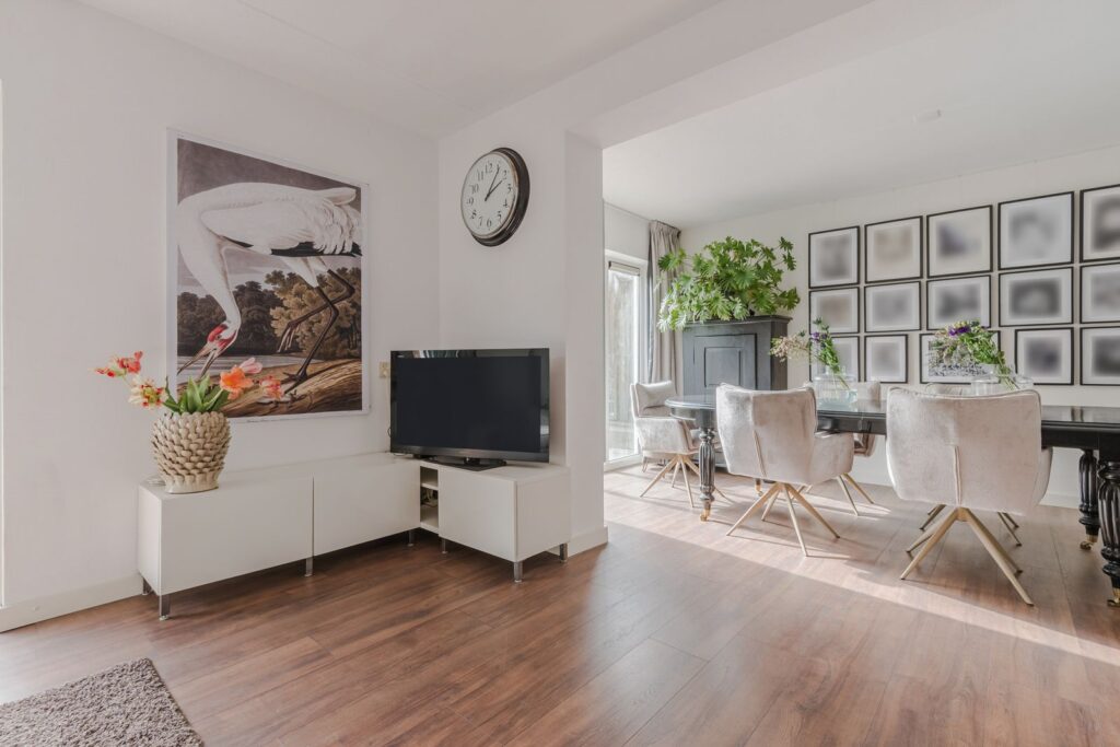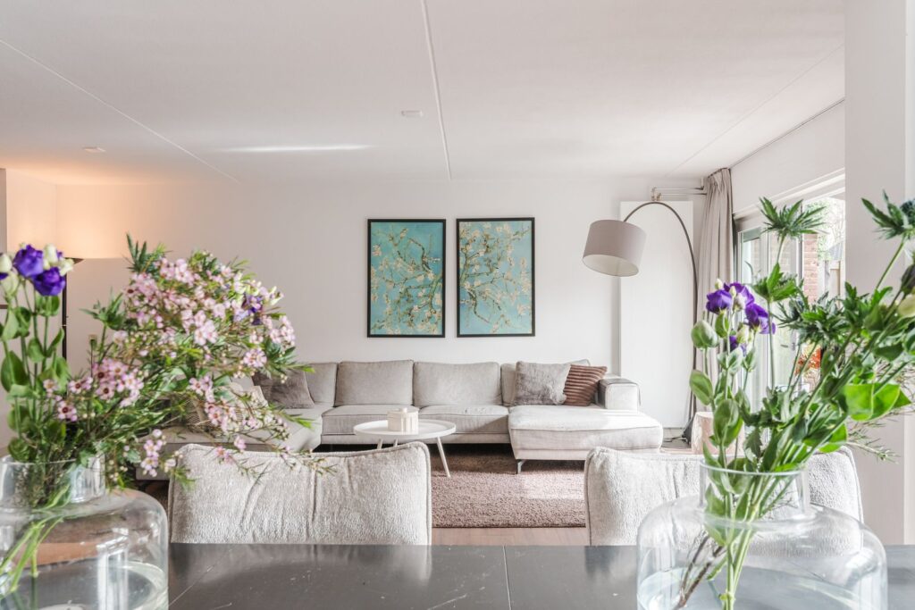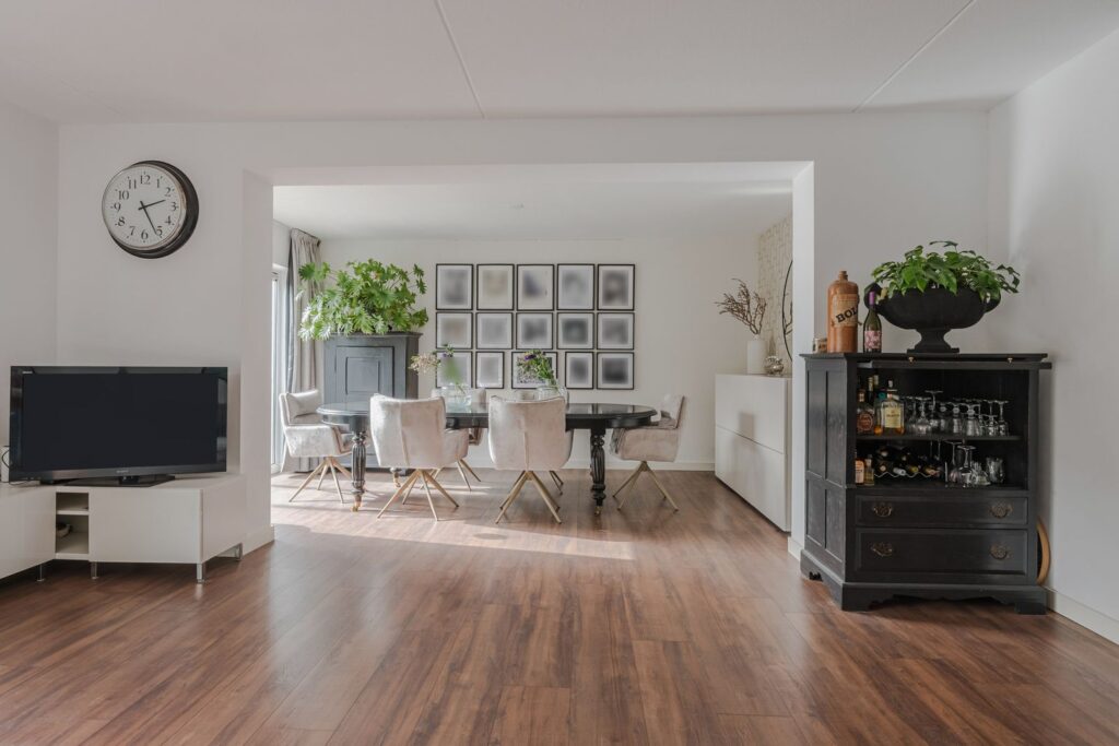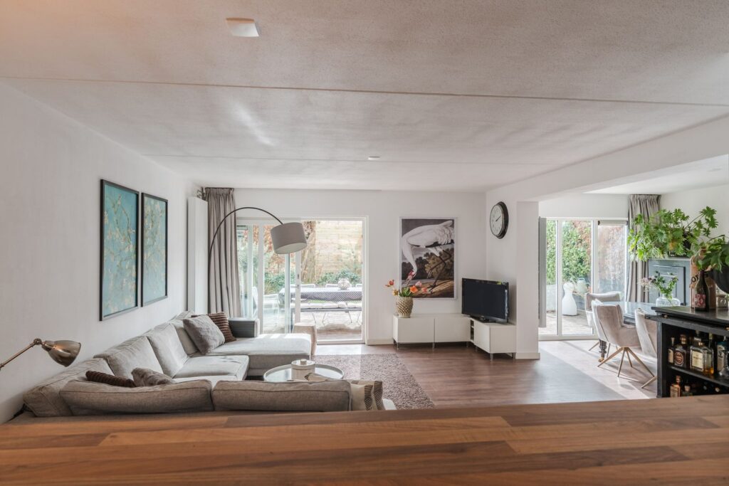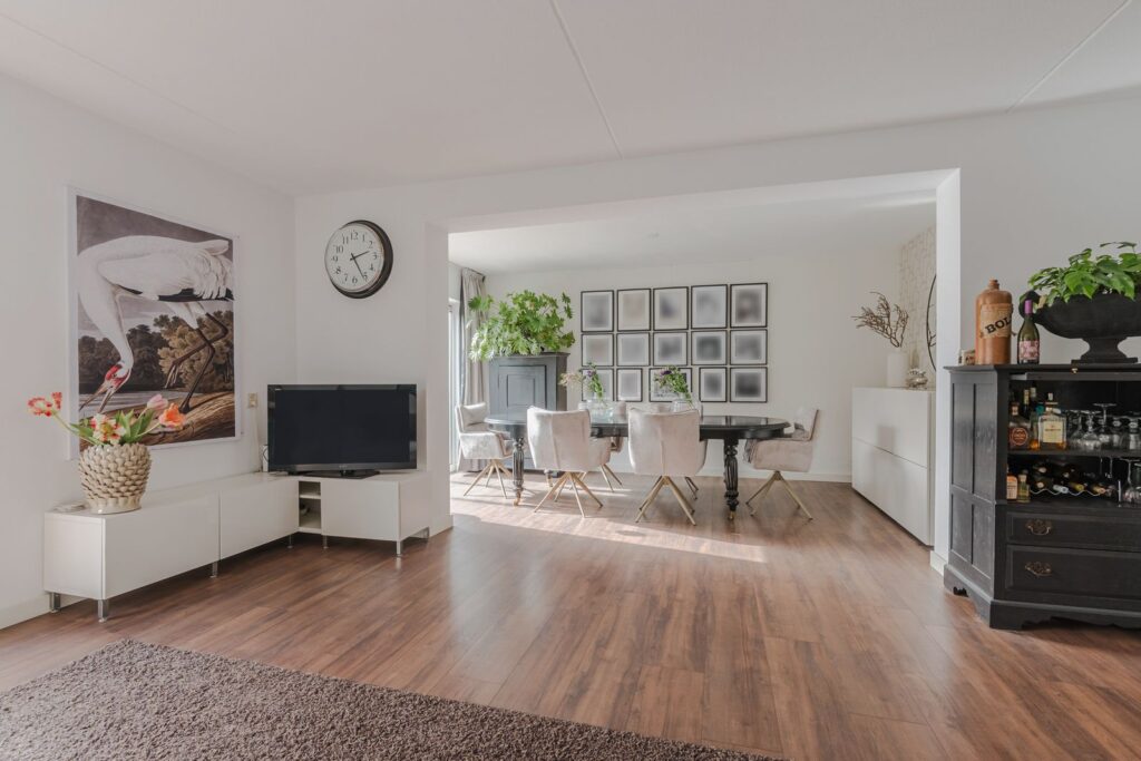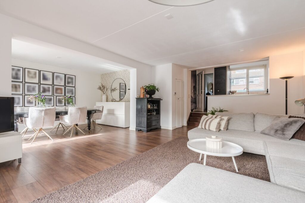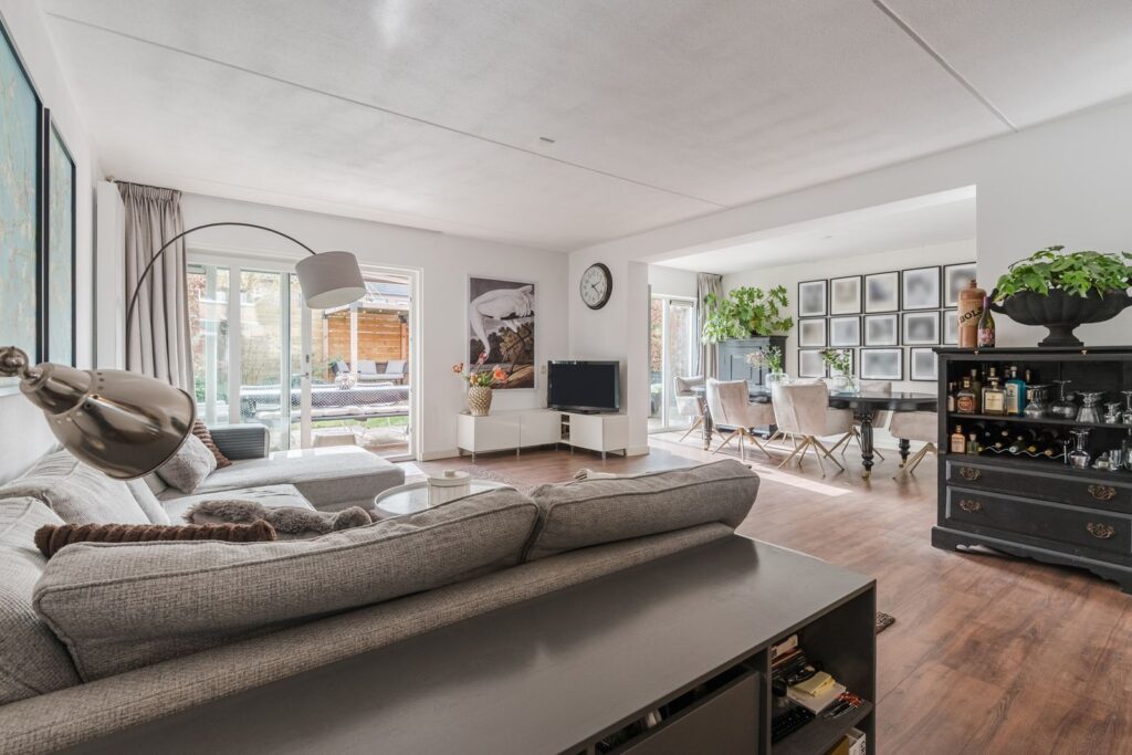 De ruime, lichte woonkamer (ca. 50 m²) heeft een fijne sfeer en is voorzien van een schuifpui naar de zonnige achtertuin. Aan de achtergevel bevindt zich bovendien een zonnescherm. De hal, woonkamer en keuken zijn afgewerkt met een moderne laminaatvloer (2022).
