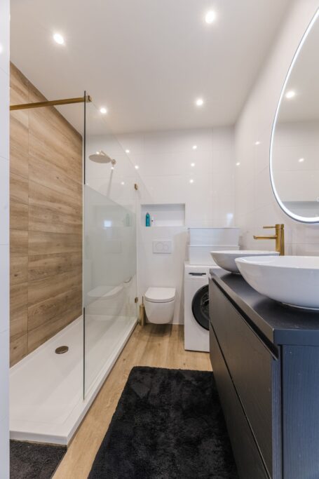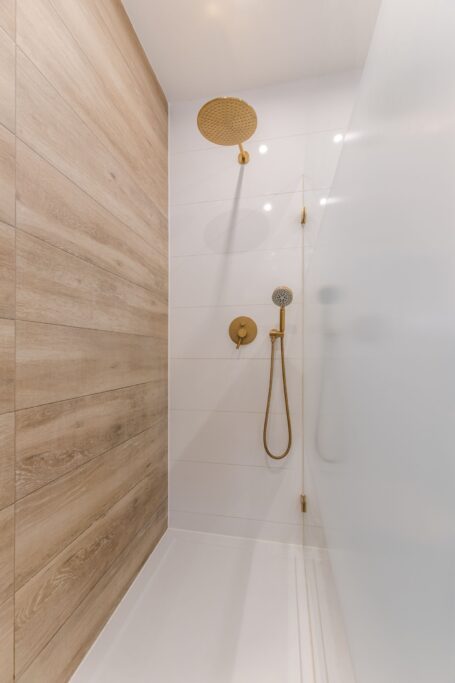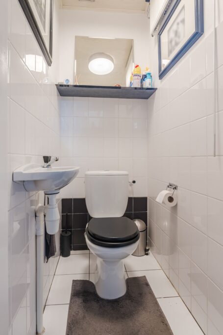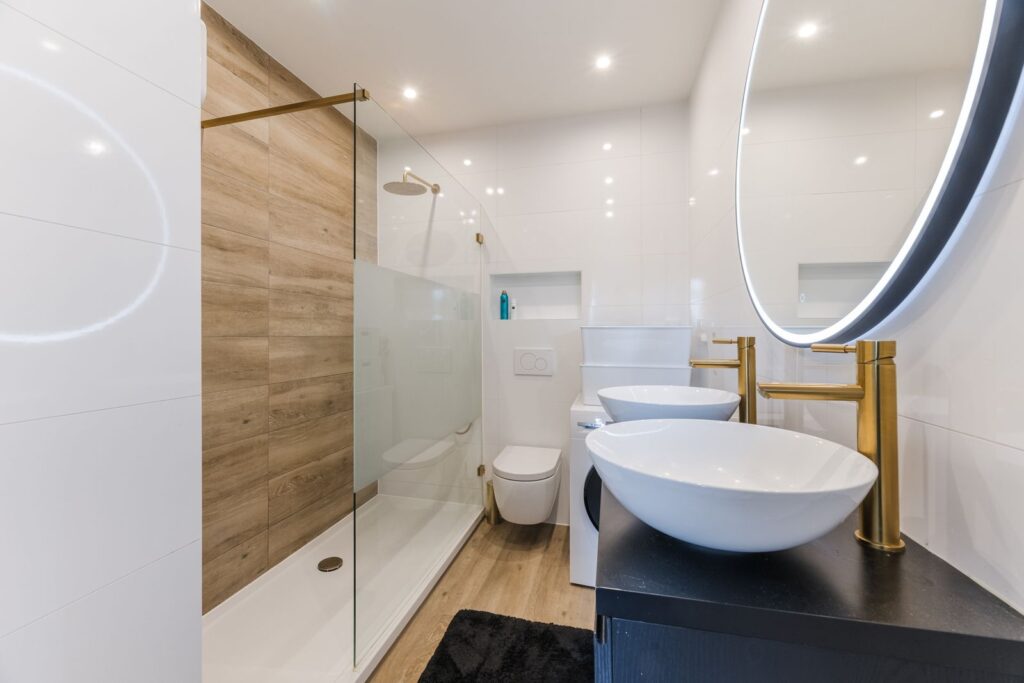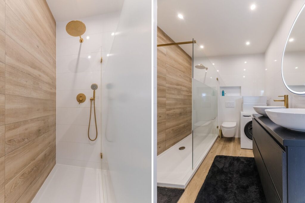 De moderne badkamer (2023) is volledig betegeld en voorzien van een royale inloopdouche (met vast glazen scherm, stortdouche en handdouche), wastafelmeubel en zwevend toilet.