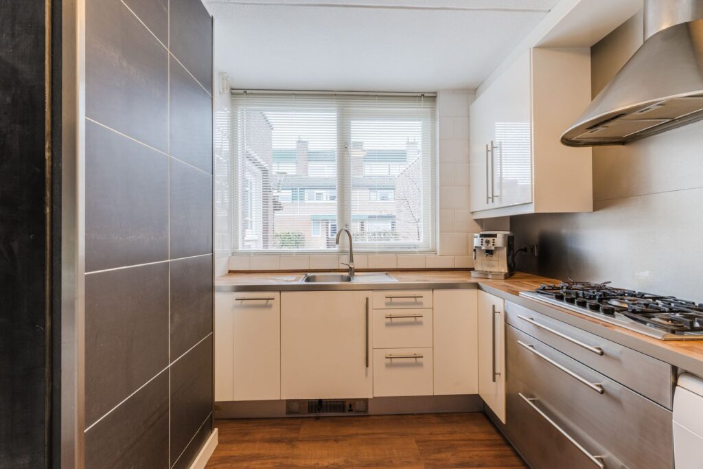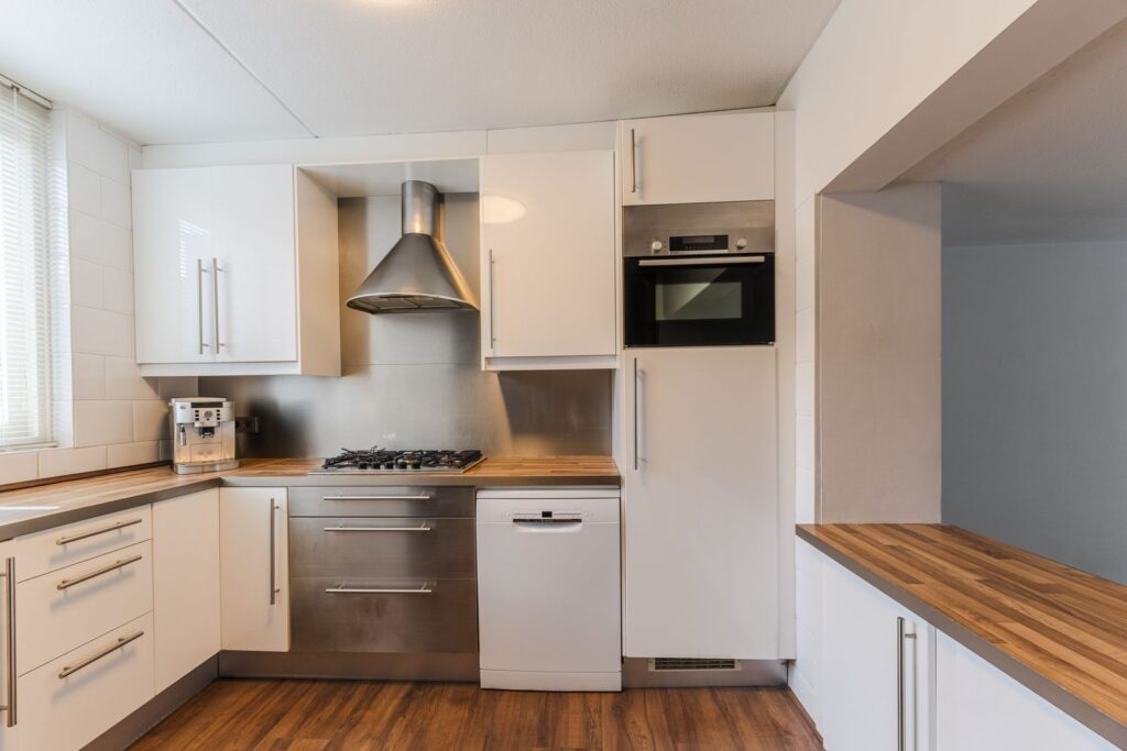 De open keuken ligt aan de voorzijde van de woning en is uitgerust met een 5 pits gasfornuis, afzuigkap, combimagnetron, vaatwasser en koelkast.