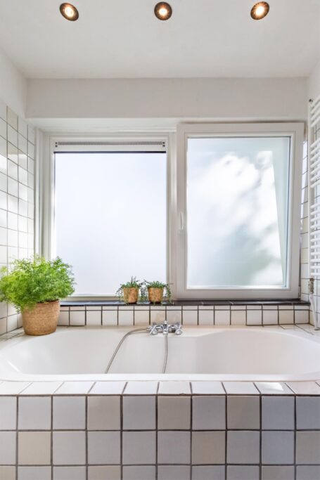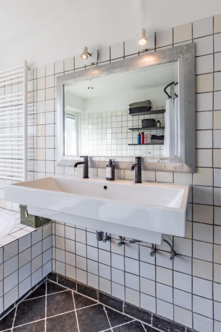 De badkamer is compleet uitgevoerd met vloerverwarming, ligbad, douche, toilet en dubbele wastafel.