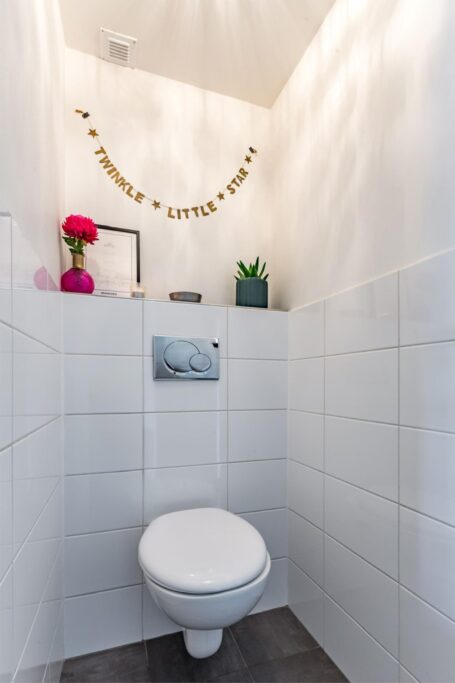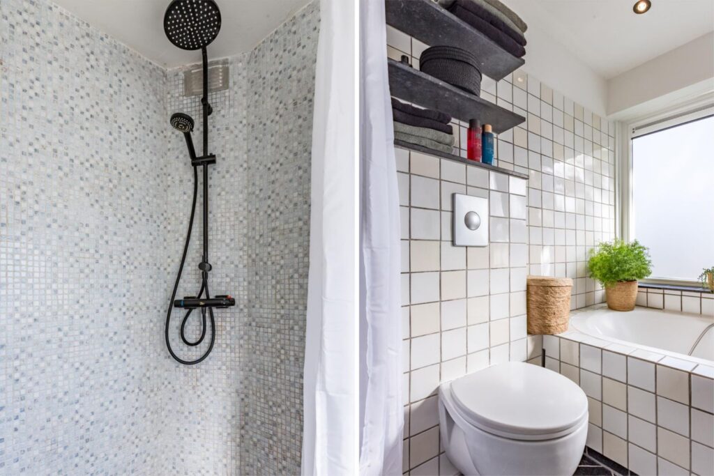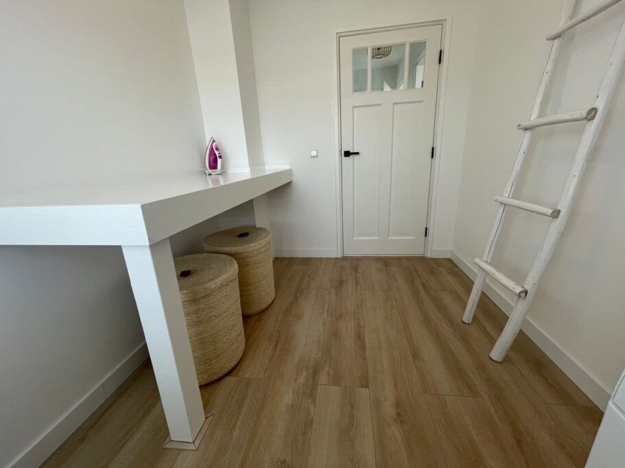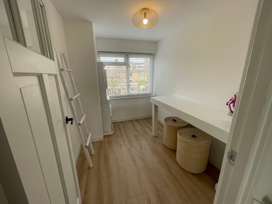 Daarnaast is er ruimte voor een werkplek en veel bergruimte dankzij de inloopkast, vide en knieschotten. De CV-ketel (Remeha Quinta) is netjes weggewerkt.